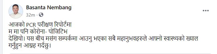 सोमबार गरिएको पीसीआर परीक्षणमा कोरोना संक्रमण भएपछि मन्त्री नेम्बाङ होम आइसोलेसनमा बस्नुभएको उहाँका प्रेस संयोजक संयोजक सन्दीप राईले जानकारी दिनुभयो । मन्त्री नेम्वाङले आफूसँग सम्पर्कमा रहनुभएकालाई पनि होसियारी अपनाउन अपिल गर्नुभएको छ ।