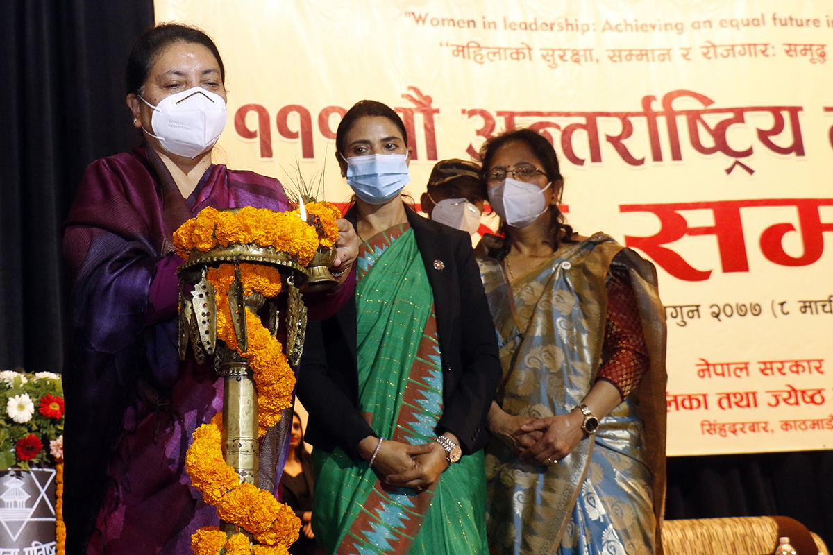 १११औँ अन्तरराष्ट्रिय महिला दिवसका अवसरमा महिला, बालबालिका तथा ज्येष्ठ नागरिक मन्त्रालयद्वारा सोमबार राजधानीमा आयोजित समारोहको उद्घाटन गर्दै राष्ट्रपति भण्डारीले आर्थिक समानताबिना सामाजिक तथा सांस्कृतिक विभेदको अन्त्य हुन नसक्ने र त्यसका लागि संविधानले मार्गदर्शन गरेको न्याय र समानतामा आधारित समाजवादउन्मुख अर्थतन्त्र निर्माण गर्नुपर्ने आवश्यकता औँल्याउनुभयो ।
