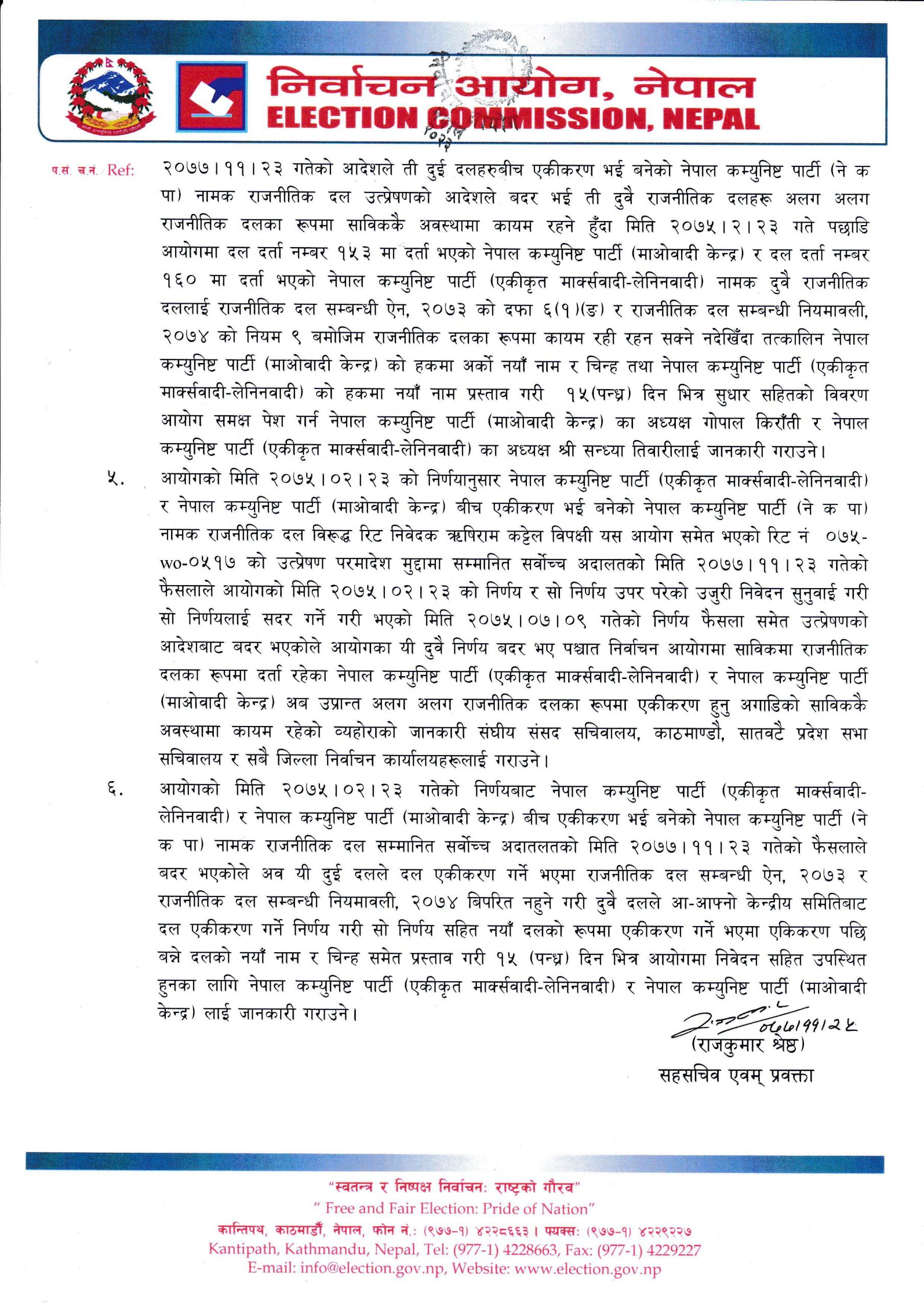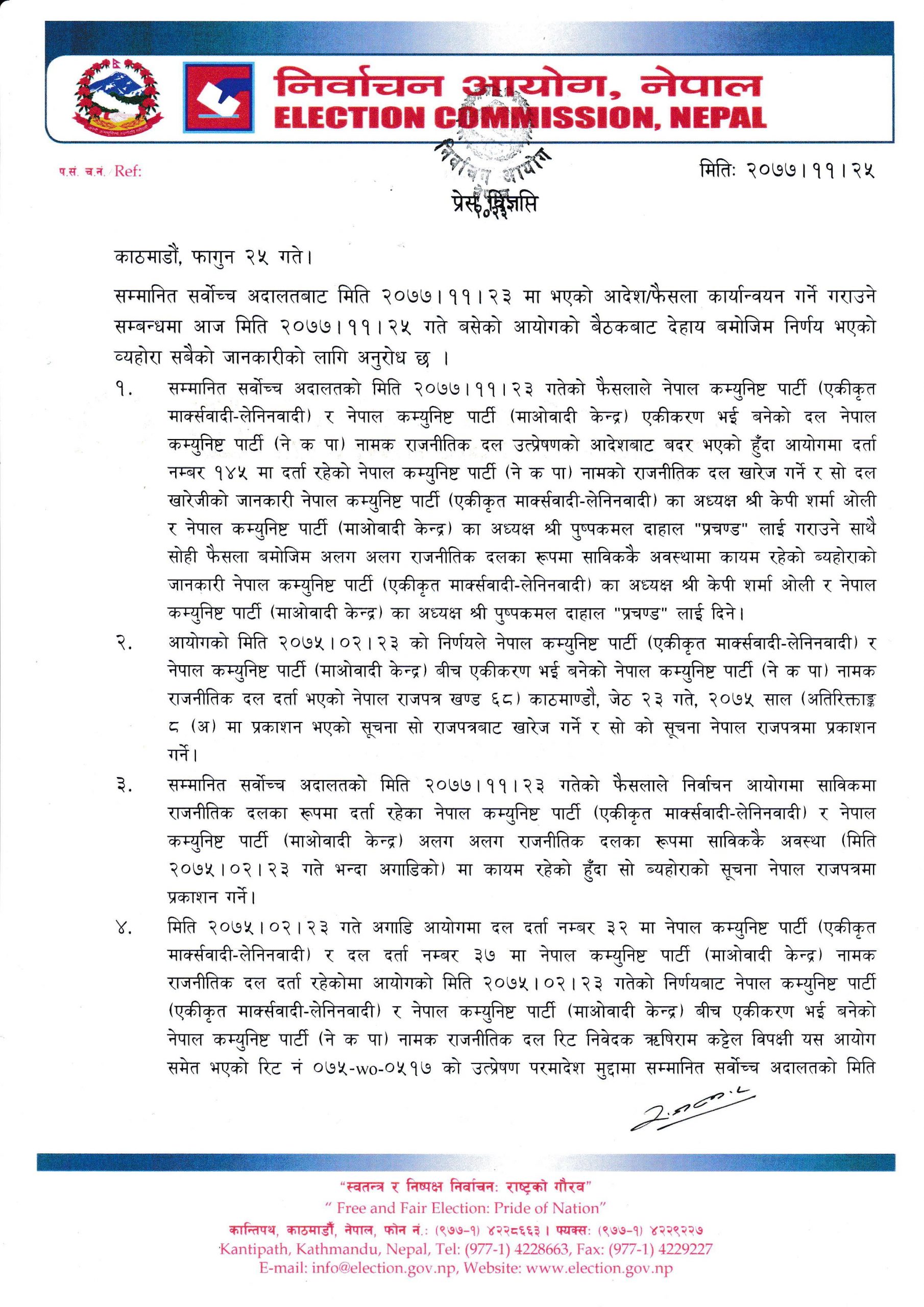 निर्वाचन आयोगद्वारा नेकपा खारेज, एकीकरण गर्ने भए १५ दिनभित्र आउन सूचना