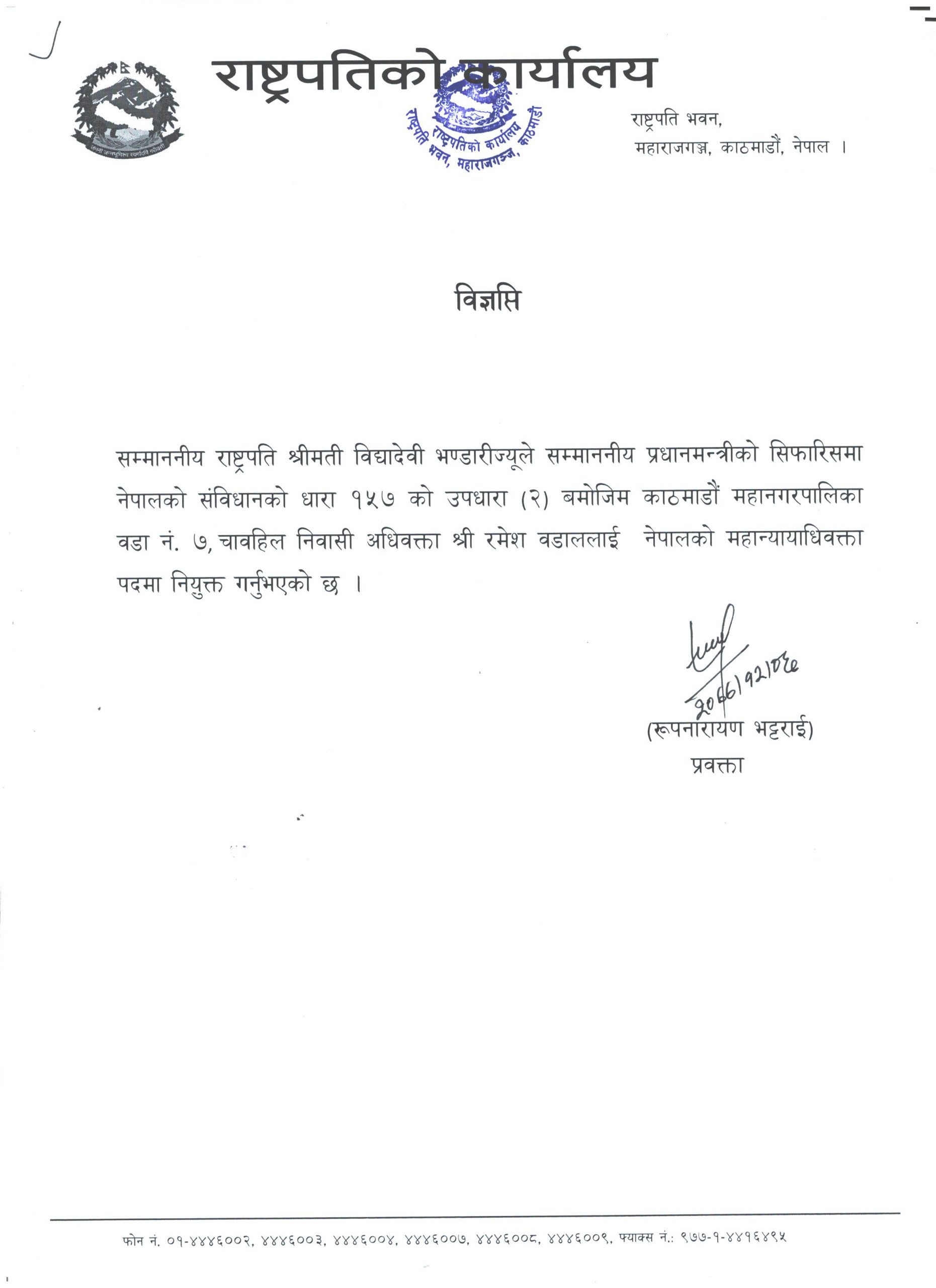 काठमाडौं- राष्ट्रपति विद्यादेवी भण्डारीले प्रधानमन्त्रीका सिफारिशमा नेपालको संविधानको धारा १५७ को उपधारा (२) बमोजिम काठमाडौँ महानगरपालिका–७, चाबहिल निवासी अधिवक्ता रमेश बडाललाई नेपालका महान्यायाधिवक्तामा नियुक्त गर्नुभएको छ ।