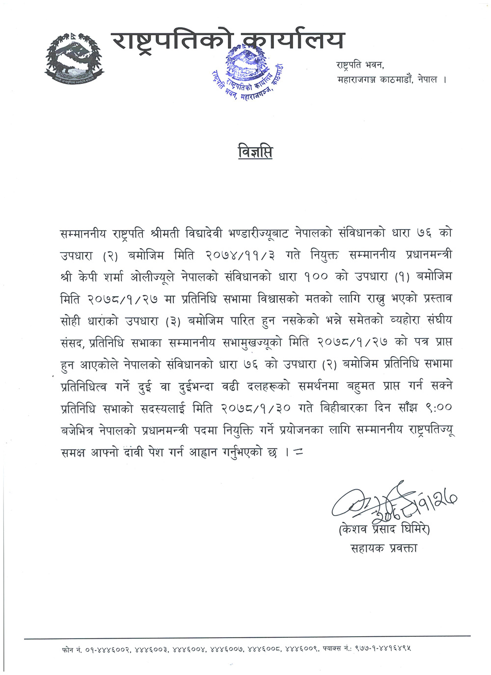 यही वैशाख ३० गते साँझ ९ बजेभित्र प्रतिनिधिसभामा प्रतिनिधित्व गर्ने दलका समर्थनमा प्रधानमन्त्रीमा नियुक्तिका लागि राष्ट्रपतिसमक्ष आफ्नो दावी पेश गर्न आह्वान गरिएको राष्ट्रपतिको कार्यालयका सहायक प्रवक्ता केशवप्रसाद घिमिरेले विज्ञप्तिमार्फत जानकारी दिनुभएको छ ।
