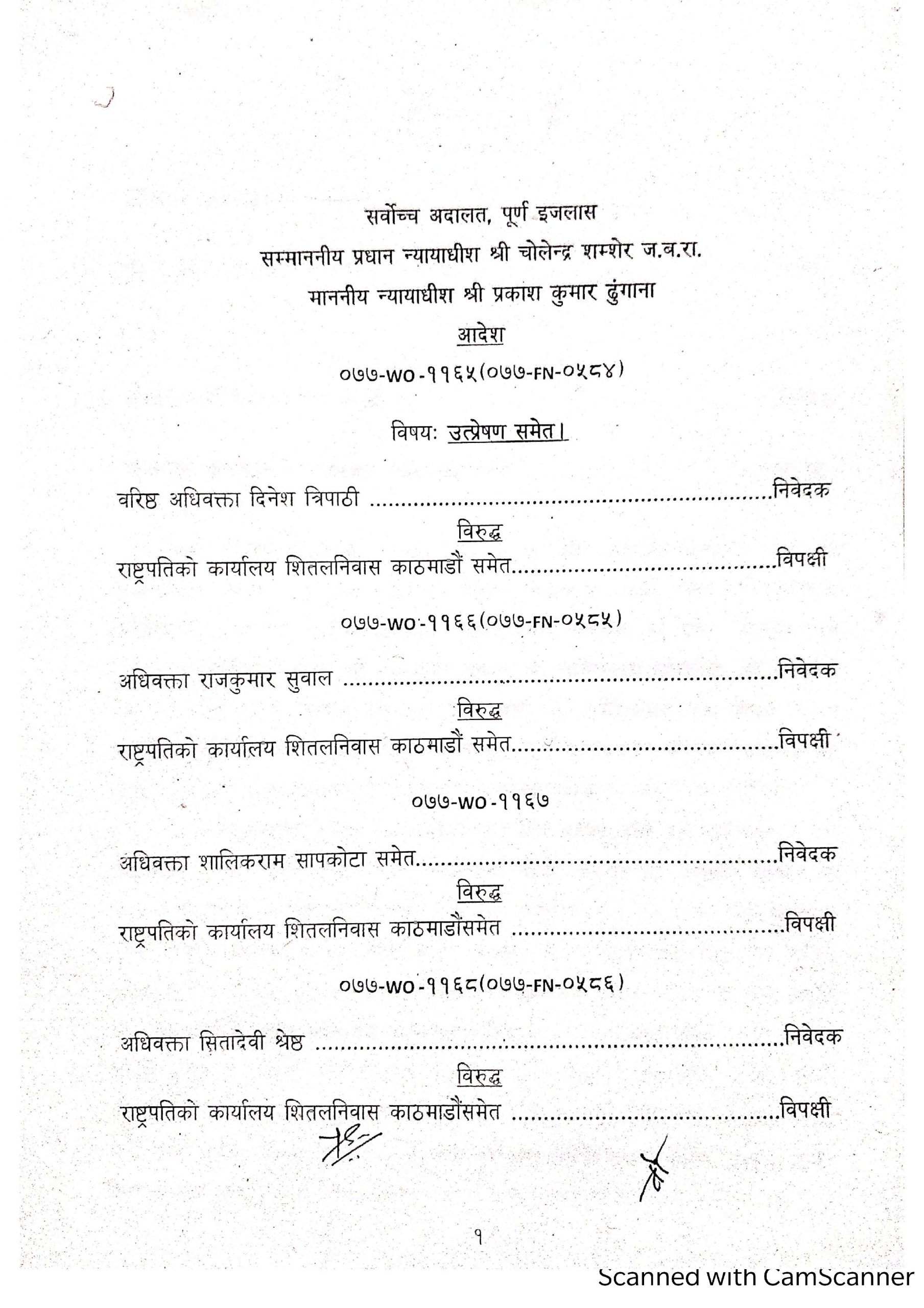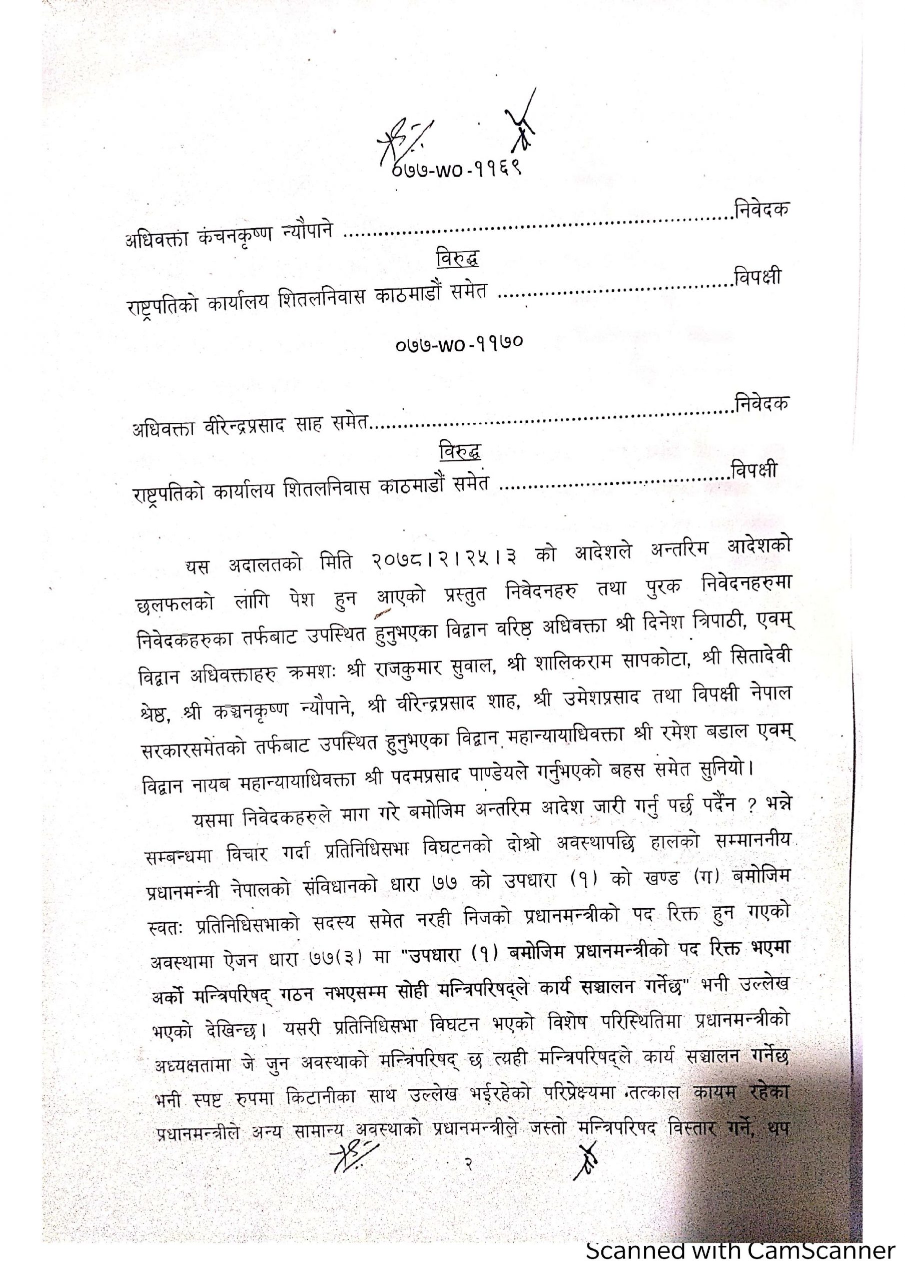 वरिष्ठ अधिवक्ता दिनेश त्रिपाठी तथा अधिवक्ताहरू राजकुमार सुवाल, शालिकराम सापकोटा, लगायतका अधिवक्ताले राष्ट्रपति कार्यालयलाई विपक्षी बनाई सर्वोच्च अदातलमा मन्त्रिपरिषद् विस्तार खारेजीको माग गर्दै मुद्दा दर्ता गर्नु भएको थियो । यसअघि पनि अदालतले गैरसांसदलाई मन्त्री नियुक्त गर्नु संविधानविपरीत भएको जेठ पहिलो साता माओवादीबाट एमालेमा प्रवेश गरी मन्त्री बन्नु भएका रामबहादुर थापा, टोपबहादुर रायमाझीलगायत सातजना मन्त्रीहरूलाई पदमुक्तको फैसला सुनाएको थियो ।