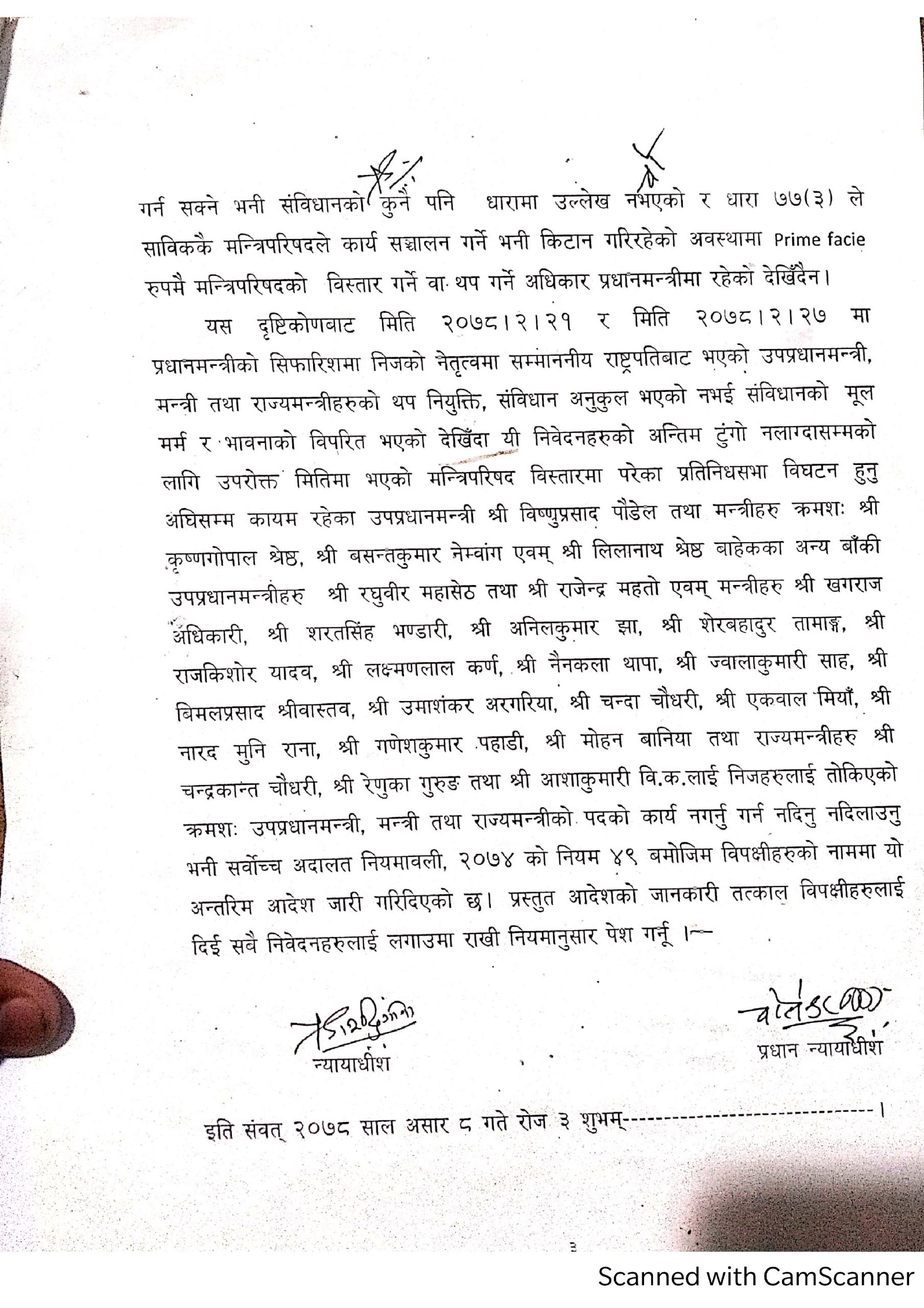 प्रधानन्यायाधीश चोलेन्द्र शमशेर जबरा र न्यायाधीश प्रकाशकुमार ढुङ्गानाको संयुक्त इजलासले मन्त्रीहरूको नियुक्ति ‘संविधानअनुकूल भएको नभई संविधानको मूल मर्म र भावनाको विपरीत भएको देखिएको’ भन्दै मन्त्रीहरुलाई काम काज गर्न रोक लागाएको छ ।