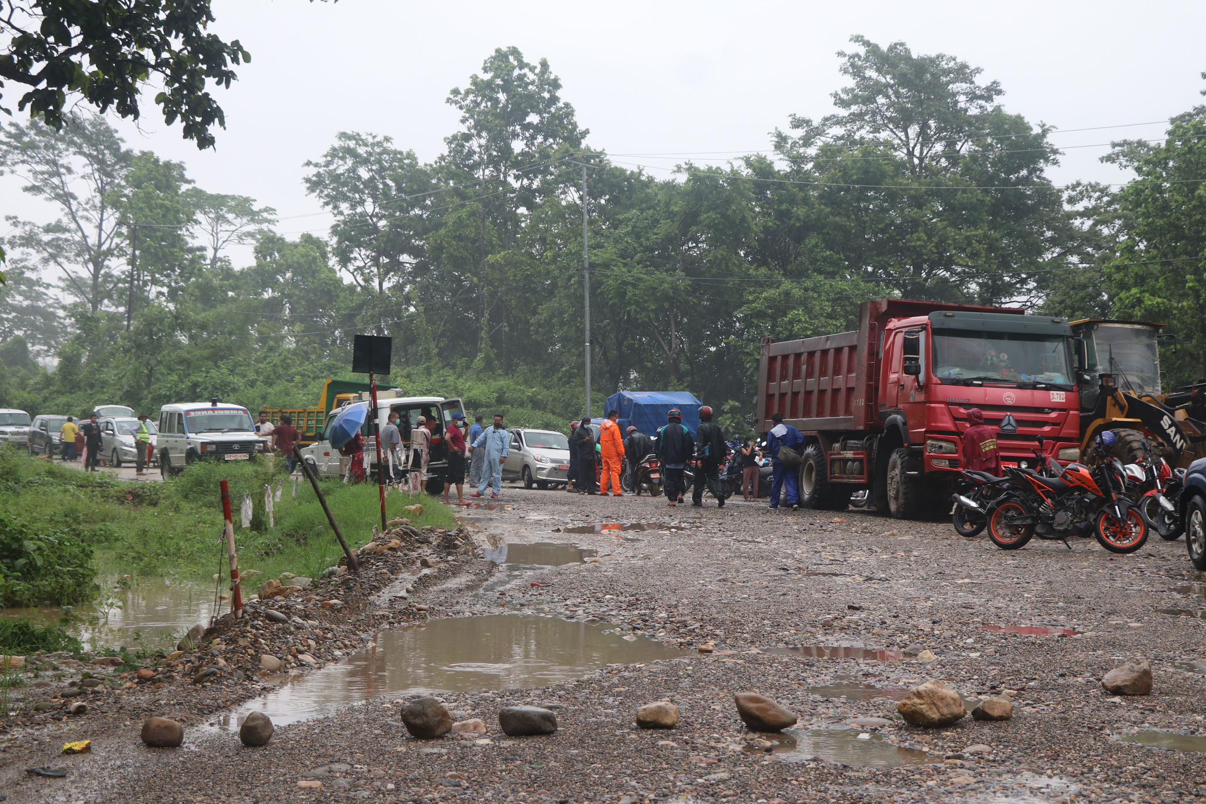 सुरक्षा निकायले जेसिबीको सहायताले एकतर्फी भए पनि सवारी साधन सञ्चालन गर्न मिल्ने गरी काम गरिरहेको नाथले बताउनुभयो । पूर्वपश्चिम राजमार्गको यस खण्डमा आज बिहानसम्म पनि सवारी साधन सञ्चालन हुन नसक्दा सडकमा पूर्व र पश्चिम जाने सवारी साधनको करिब चार किलोमिटर भन्दा लामो लाइन छ । राजमार्ग विस्तारका लागि साना पुल हटाएर नयाँ मोटरेबल पुल निर्माण गर्ने क्रममा सवारी साधन सञ्चालनका लागि बनाइएको डाइभर्सन बाढीले बगाएको थियो ।
