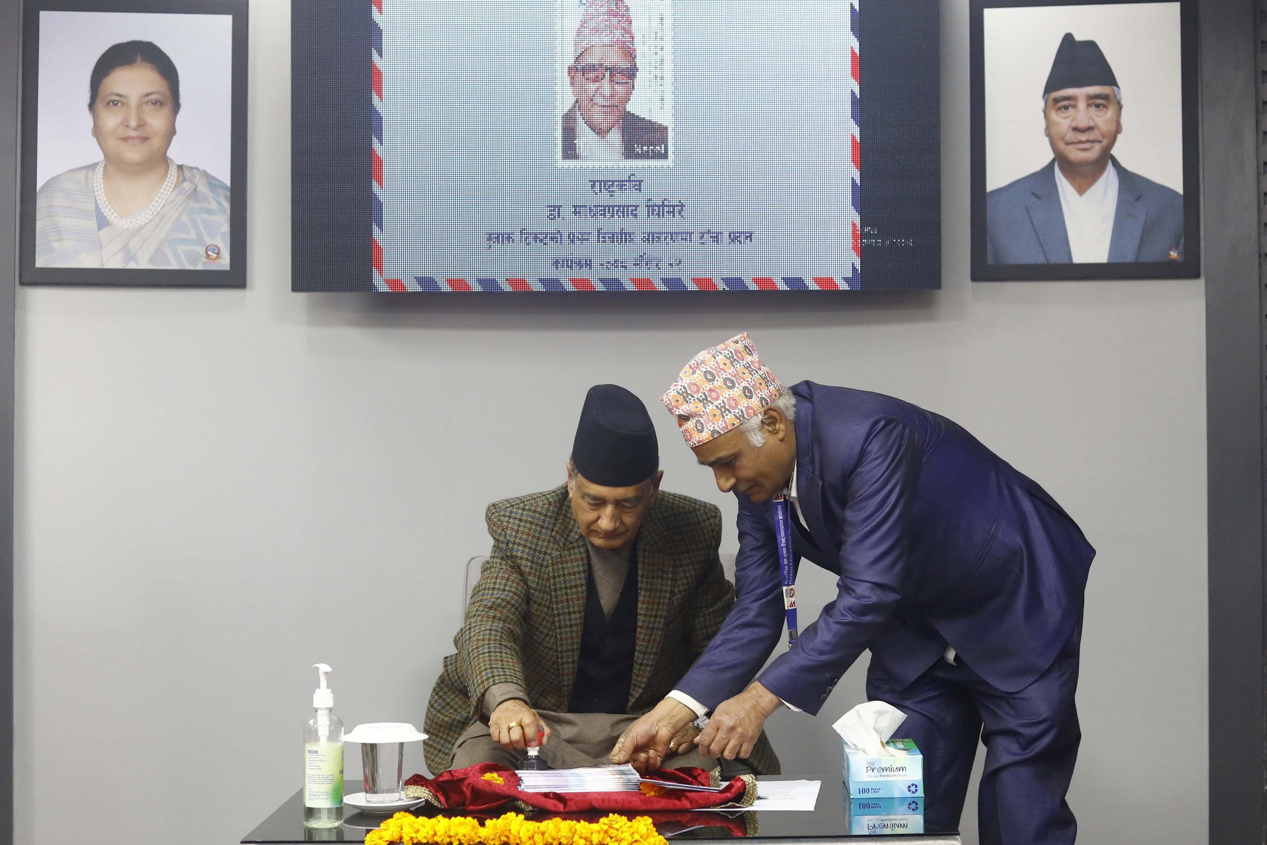 काठमाडौं- राष्ट्रकवि माधवप्रसाद घिमिरेले नेपाली साहित्यको क्षेत्रमा पुर्याएको योगदानको कदरस्वरुप उहाँको मुखाकृति अङ्कित हुलाक टिकट प्रकाशन गरिएको छ । राष्ट्रकवि घिमिरेले नेपालको राष्ट्रिय गौरवलाई उचाइमा पुर्याउन दिनुभएको अतुलनीय योगदानको उच्च कदर गर्दै आज सूचना, सञ्चार तथा प्रविधिमन्त्री ज्ञानेन्द्रबहादुर कार्कीले सो हुलाक टिकटमा टाँचा प्रदान गर्नुभयो ।