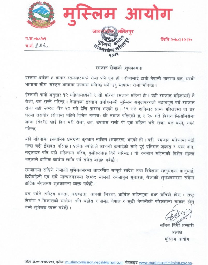 अध्यक्ष अन्सारीद्वारा रमजान रोजाको शुभकामना
