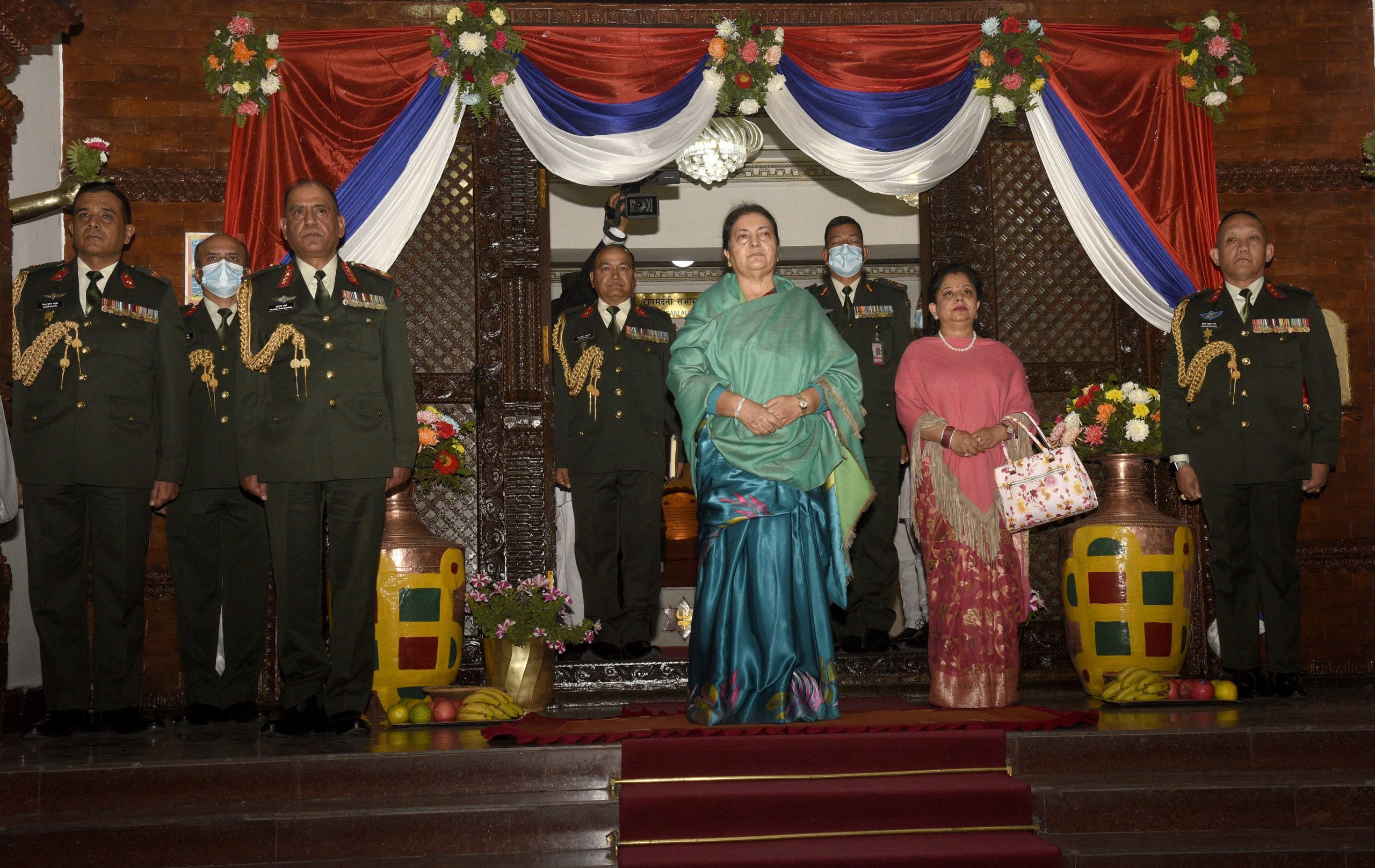 काठमाडौं- राष्ट्रपति विद्यादेवी भण्डारी महाशिवरात्रि तथा नेपाली सेना स्थापनाको दुई सय ६०औँ वार्षिकोत्सवका अवसरमा सैनिक मुख्यालय जङ्गी अड्डामा सोमबार साँझ आयोजित सांस्कृतिक कार्यक्रम तथा स्वागत समारोहमा सहभागी हुनुभयो ।
