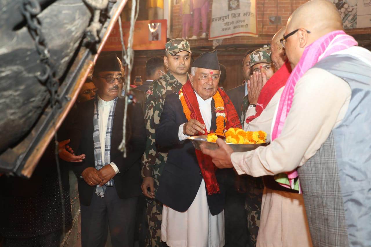 काठमाडौं- राष्ट्रपति रामचन्द्र पौडेलले असनमा मच्छिन्द्रनाथको रथको दर्शन गरी प्रसाद ग्रहण गर्नुभएको छ । सेतो मच्छिन्द्रनाथको रथ तानेर असन ल्याइएको राति राष्ट्राध्यक्षले असनमै पुगेर पूजा एवं दर्शन गरी प्रसाद ग्रहण गर्नुभएको हो ।