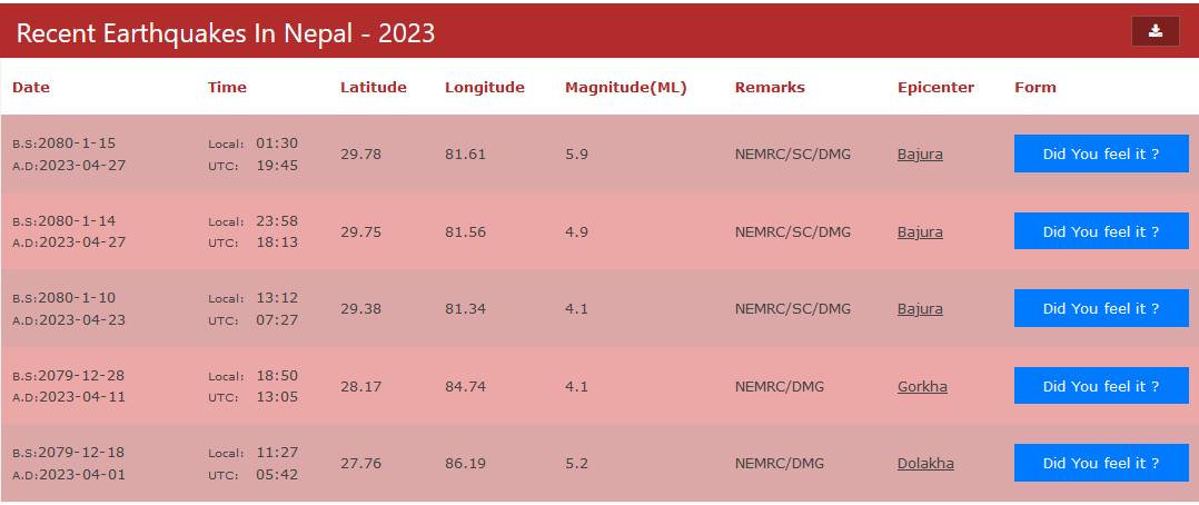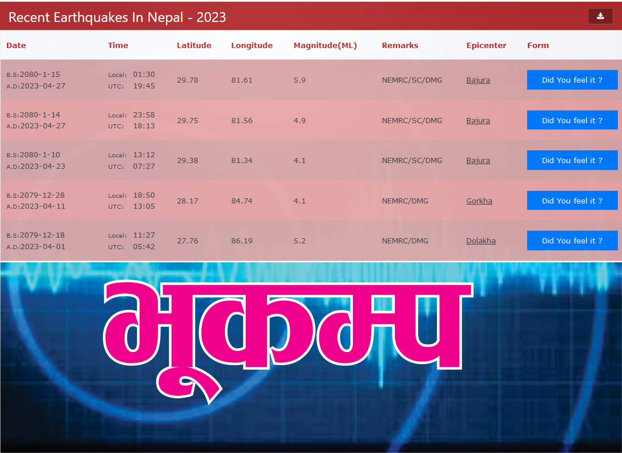 यस्तै वैशाख १० गते ४.१ म्याग्निच्युडको भूकम्प गएको राष्ट्रिय भूकम्प मापन केन्द्रले जनाएको छ । यसअघि गोरखा केन्द्रविन्दु भएर चैत २८ गते ४ दशमलव १ म्याग्निच्युडको भूकम्प जाँदा चैत १८ गते दोलखा केन्द्रविन्दु भएर ५ दशमलव २ म्याग्निच्युडको भूकम्प गएको थियो ।