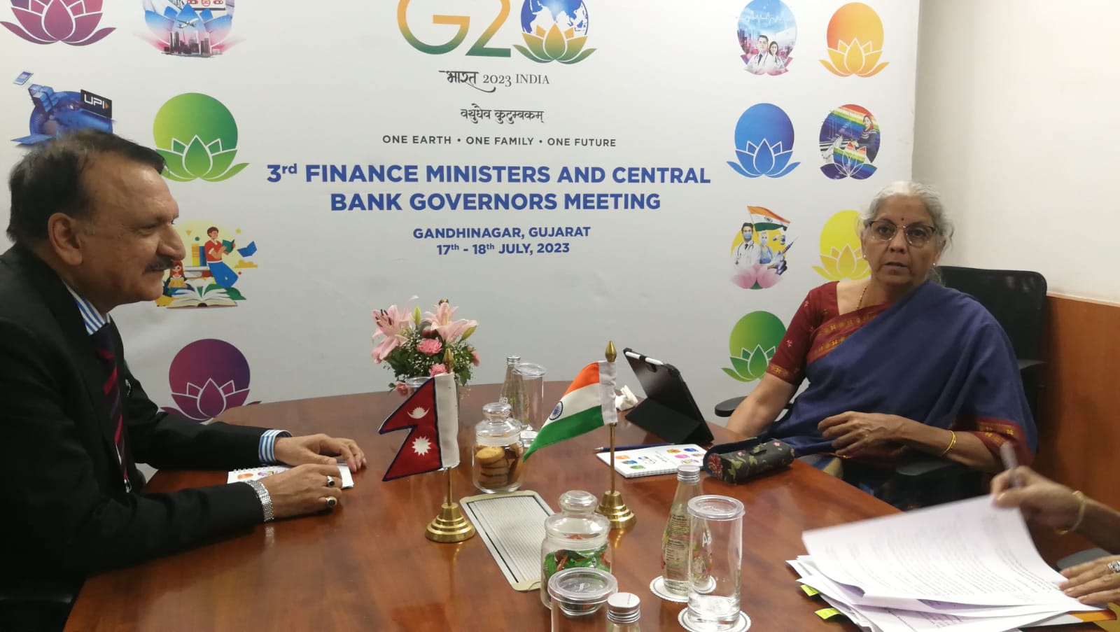 काठमाडौं- भारतको गुजरातमा भइरहेको जी–२० मुलुकका अर्थमन्त्रीहरूको बैठकका अवसरमा अर्थमन्त्री डा प्रकाशशरण महत र भारतीय अर्थमन्त्री निर्मला सीतारमणबीच आपसी सहयोग र द्विपक्षीय सम्बन्धका बारेमा छलफल भएको छ ।