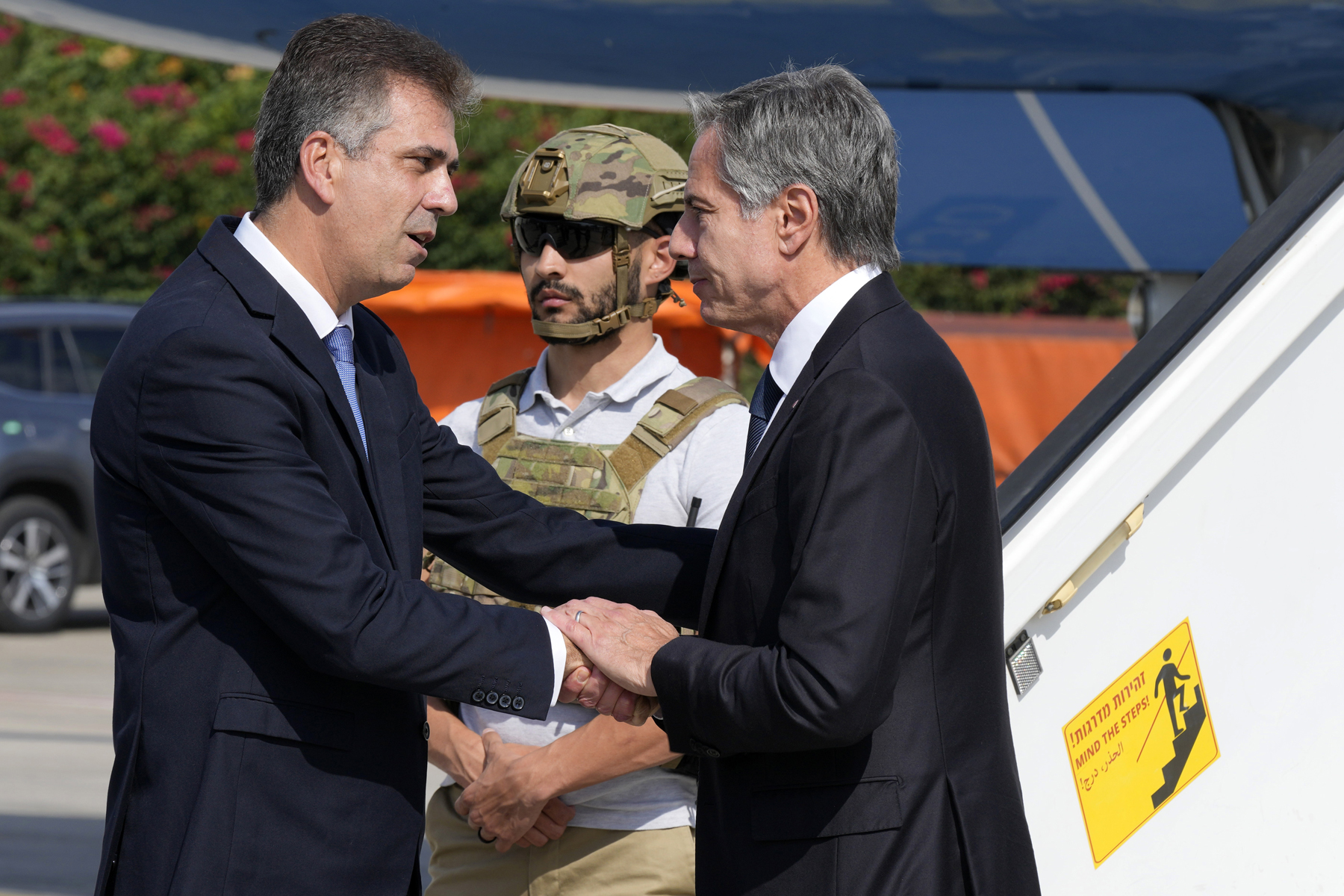 विदेशमन्त्री ब्लिङ्केनसँग रहनुभएका अमेरिकी अधिकारीहरूमा उहाँका सल्लाहकार डेरेक चोलेट, उहाँका डेपुटी चिफ अफ स्टाप टम सुलिभान, विदेश मन्त्रालयका प्रवक्ता माथ्यु मिलर, निकट पूर्वीमामिला सहायकमन्त्री बार्बरा लिफ, प्यालेस्टिन मामिलाका विशेष प्रतिनिधि ह्याडी आमर र बन्धक मामिलका लागि राष्ट्रपतिका उपविशेष दूत स्टिभ गिलन हुनुहुन्छ ।