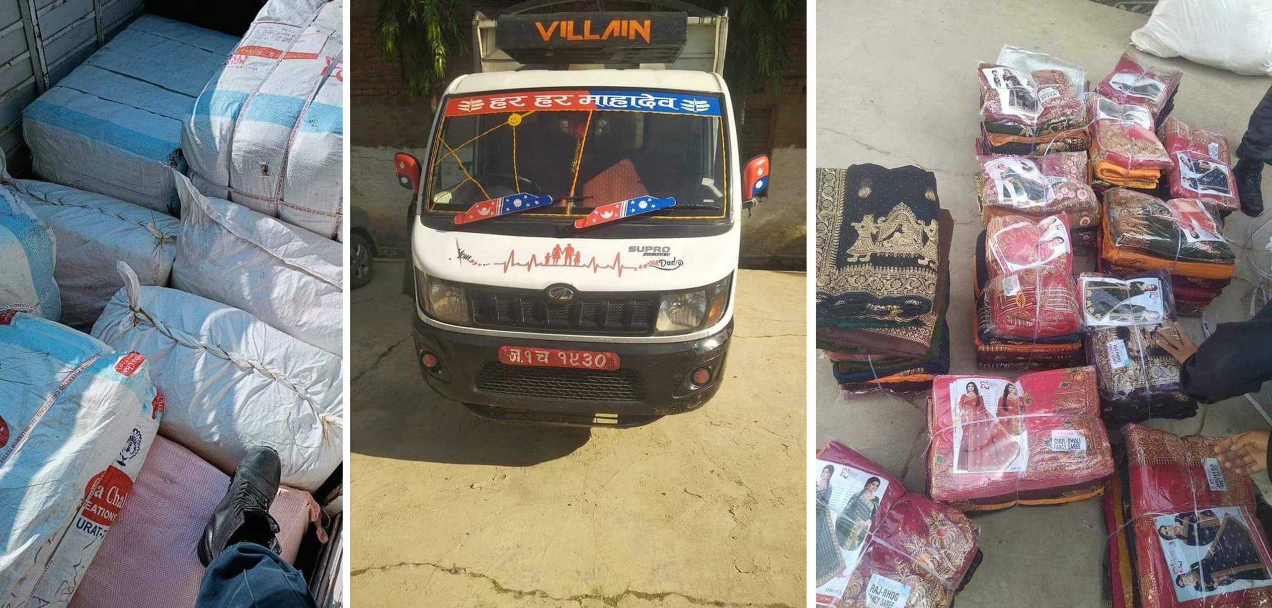 यता, जिल्ला प्रहरी कार्यालय सिरहाका प्रवक्ता प्रहरी नायब उपरिक्षक (डीएसपी) रबिन्द्र राज पाण्डेका अनुसार सिरहाको धनगढीमाई नगरपलिका-१० स्थितबाट ईलाका प्रहरी कार्यालय धनगढ़ीले गत आइतवार १५ लाख बढ़ी मूल्य बराबरका अवैध रुपमा भित्र्याइएका लत्ताकपड़ा सहितको पिकअप गाडी र सोही पालिकाको वडा नम्बर -९ स्थित चैनपुर घर भएका उतिमलाल राउत समेतलाई नियन्त्रणमा लिइएको जानकारी दिनुभएको छ ।