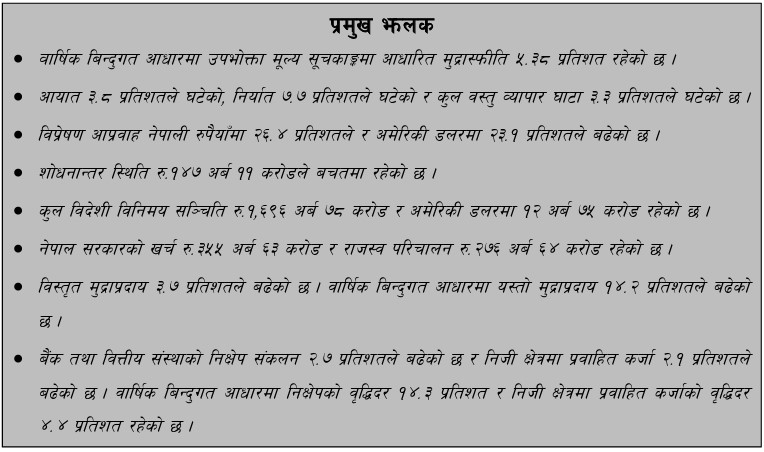 आर्थिक वर्ष २०८०/८१ को चार महिनाको आयातलाई आधार मान्दा बैकिङ्ग क्षेत्रसँग रहेको विदेशी विनिमय सञ्चिति १३ दशमलव छ महिनाको वस्तु आयात र ११ दशमलव तीन महिनाको वस्तु तथा सेवा आयात धान्न पर्याप्त रहने देखिन्छ । ।