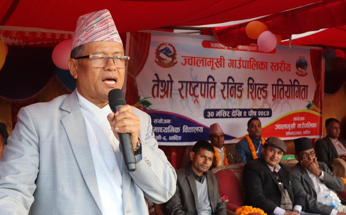 धादिङको ज्वालामुखी गाउँपालिकास्तरीय तेस्रो राष्ट्रपति रनिङ शिल्ड प्रतियोगिता समापन समारोहलाई सम्बोधन गर्दै उहाँले भन्नुभयो, “देशमा चलखेल भइरहेको छ ।