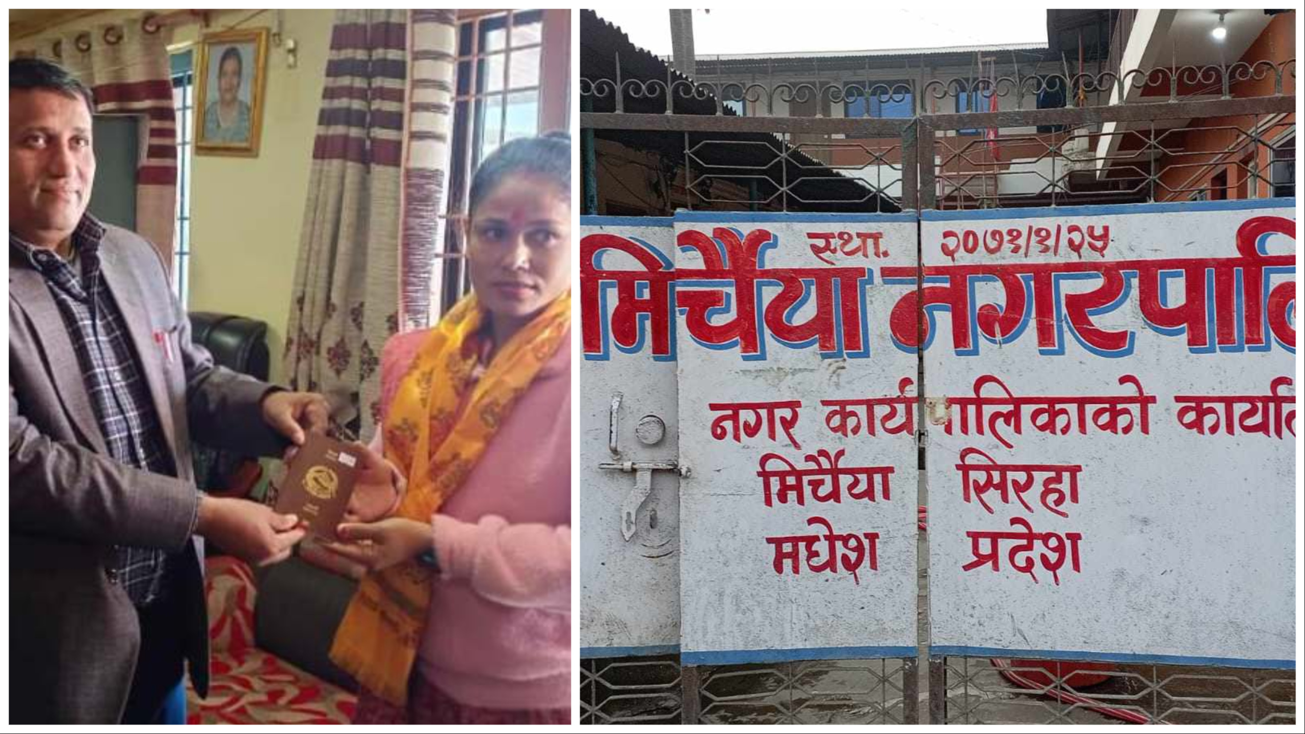 नगरप्रमुख श्रवणकुमार यादवले पहिलो दिन मिर्चैया नगरपालिका ६ की शर्मिला कुमारी घिमिरेलाई राहदानी हस्तान्तरण गर्दै सेवाको सुरुवात गर्नुभयो ।