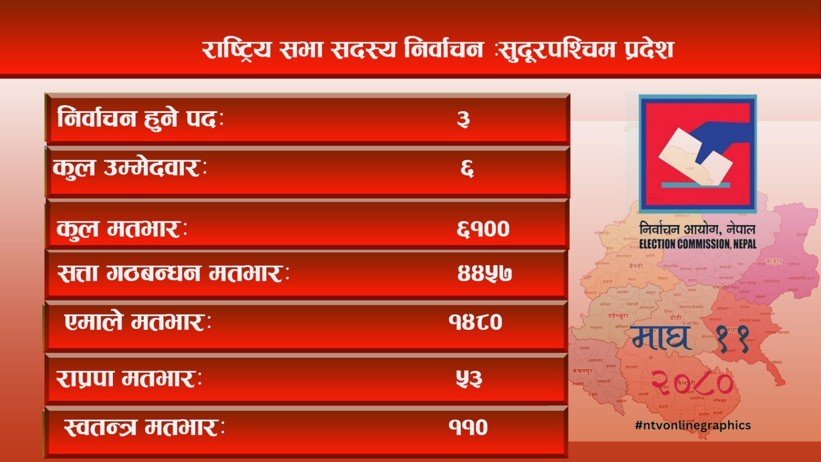 राष्ट्रियसभा सदस्य निर्वाचनका लागि सुदुरपश्चिम प्रदेशमा प्रदेशसभाका ५३ र स्थानीय तहका एक ७६ मतदाता रहेका छन् । प्रदेश सभा र स्थानीय तहको गरी कुल ६१०० मतभार रहेको छ ।