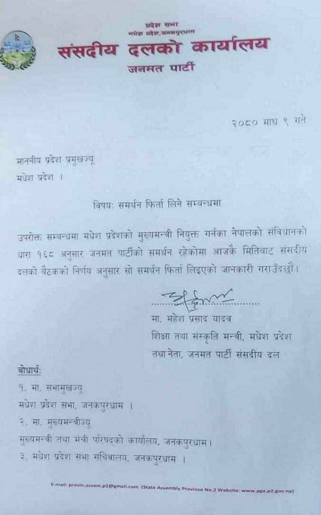 मधेश सरकारबाट बाहिरियो जनमत पार्टी