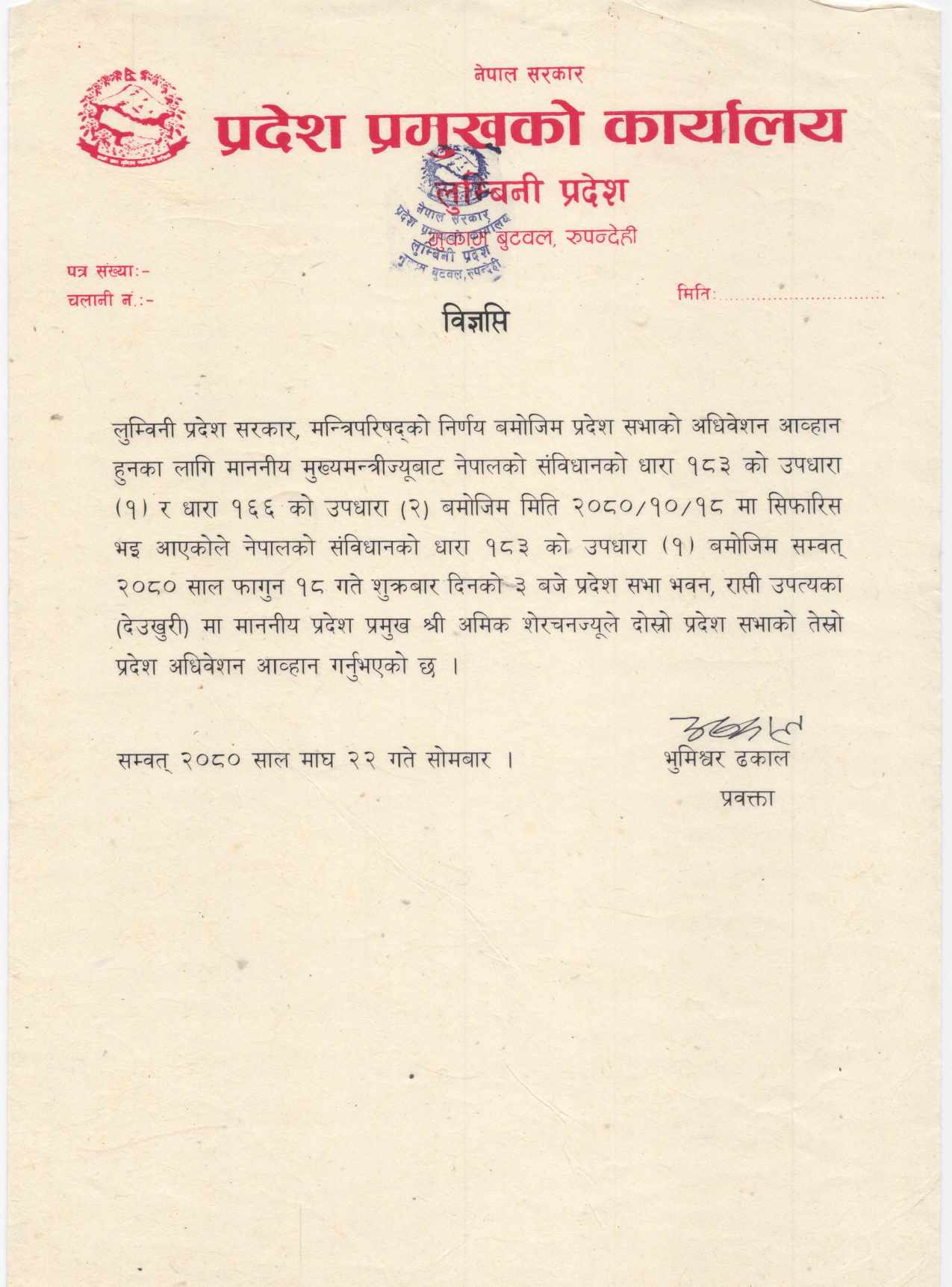 लुम्बिनी प्रदेश सरकार मन्त्रीपरिषदले सो बैठक आव्हानका लागि सिफारिस गरेको थियो ।।