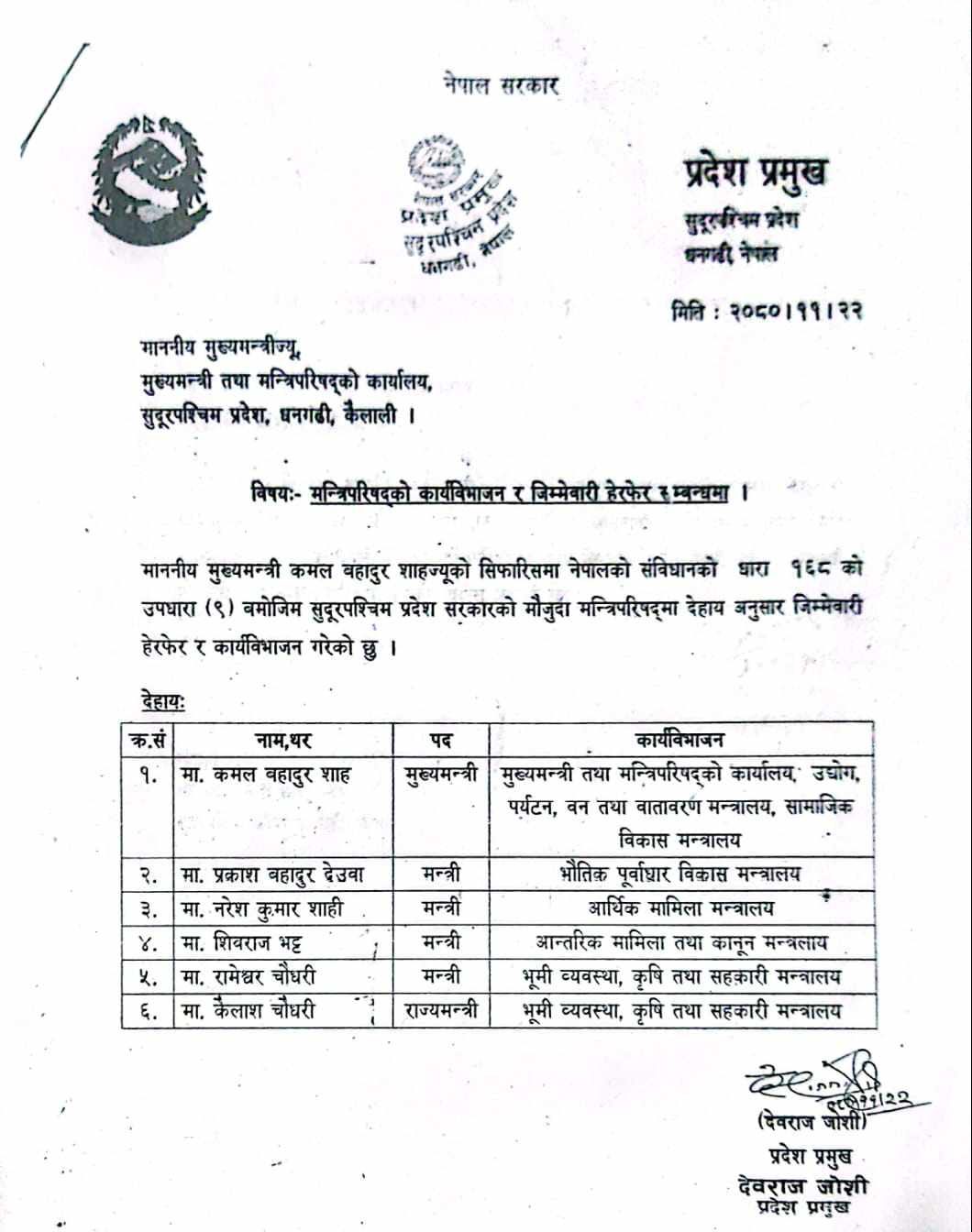 बर्खास्तपछि प्रदेश प्रमुख देवराज जाेशीले साे मन्त्रालयकाे जिम्मेवारी पनि मुख्यमन्त्री शाहलाइ ताेक्नुभएकाे छ ।