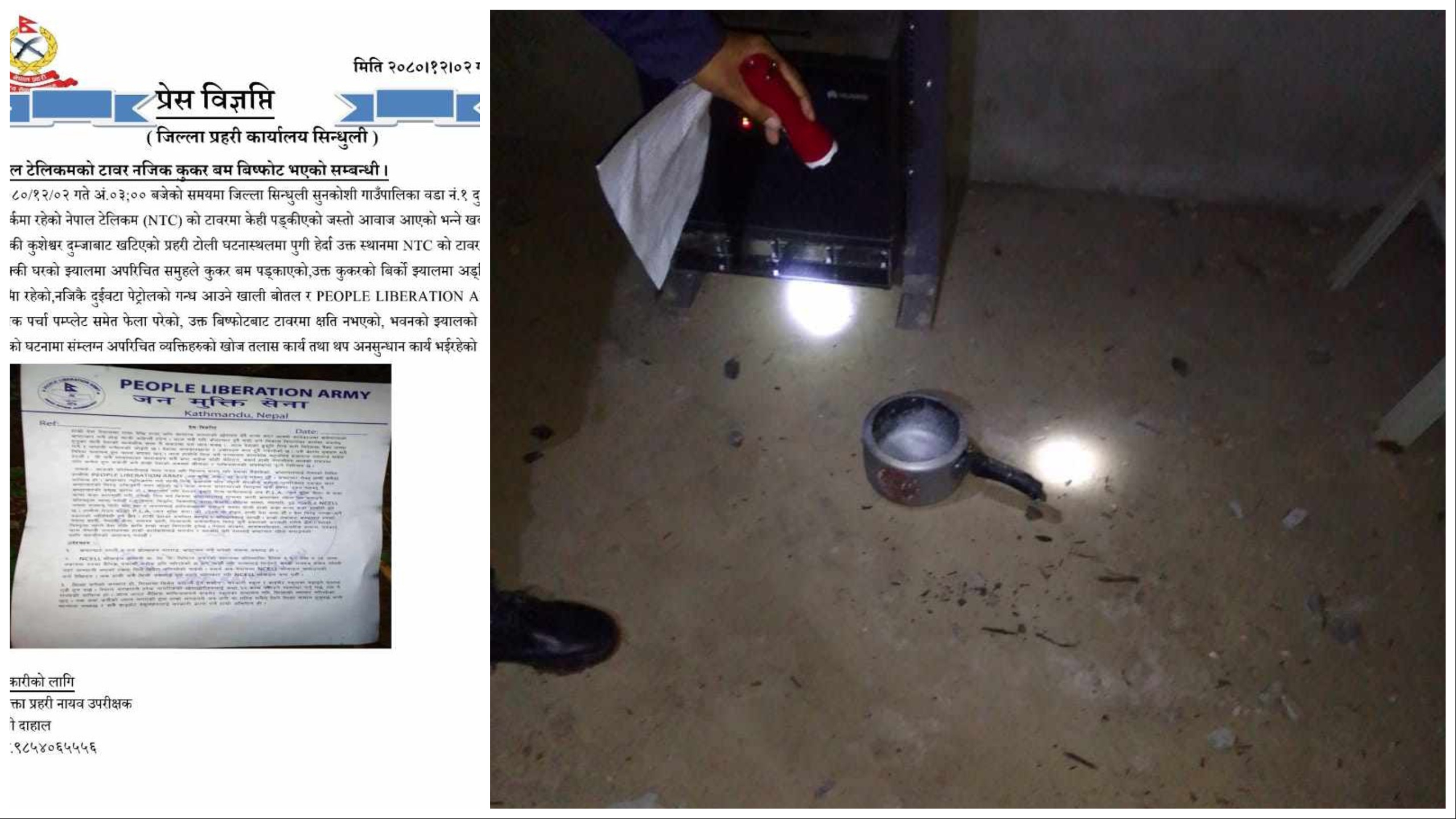 एनटिसीको टावर रहेको कम्पाउण्ड भित्रको झ्यालमा अपरिचित समुहले कुकर बम बिस्फोट गराएको पुष्टि भएको प्रहरीले जनाएको छ । प्रहरी प्रबत्ता दहालका अनुसार कुकर बमले टावरको कम्पाउण्डको झ्यालमा सामान्य क्षती पुगेको छ ।