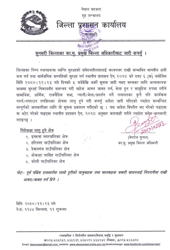 इनरुवा- जिल्ला प्रशासन कार्यालय सुनसरीले विभिन्न पाँच स्थानीय तहमा कर्फ्यू आदेश जारी गरेको छ । कामू प्रमुख जिल्ला अधिकारी वेदराज फुयालद्वारा जारी सूचनामा इनरुवा नगरपालिका, हरिनगर, देवागञ्ज, झोक्राहा नरसिंह र कोशी गाउँपालिकामा आज अपराह्न ५ बजेदेखि लागू हुने गरी कर्फ्यू आदेश जारी भएको जनाइएको छ ।