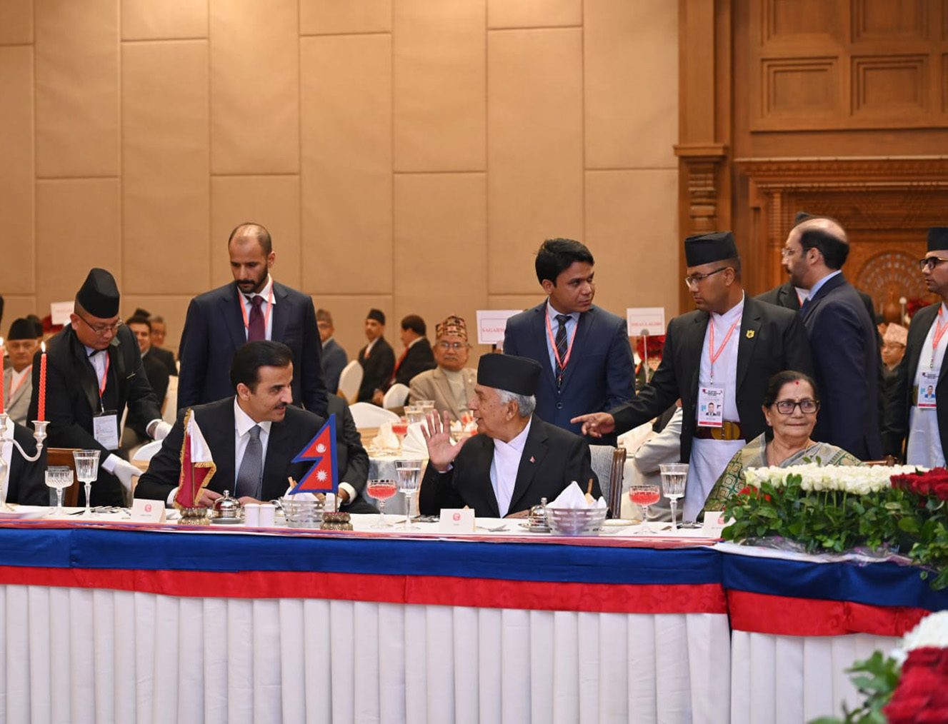 राष्ट्रपति रामचन्द्र पौडेल नेपालको दुईदिने राजकीय भ्रमणमा आउनुभएका कतारका अमिर शेख तमिम बिन हमाद अल थानीको सम्मानमा मङ्गलबार साँझ आयोजना गर्नुभएको रात्रिभोजमा सहभागीहुँदै । तस्बिर सौजन्य : राष्ट्रपति कार्यालय