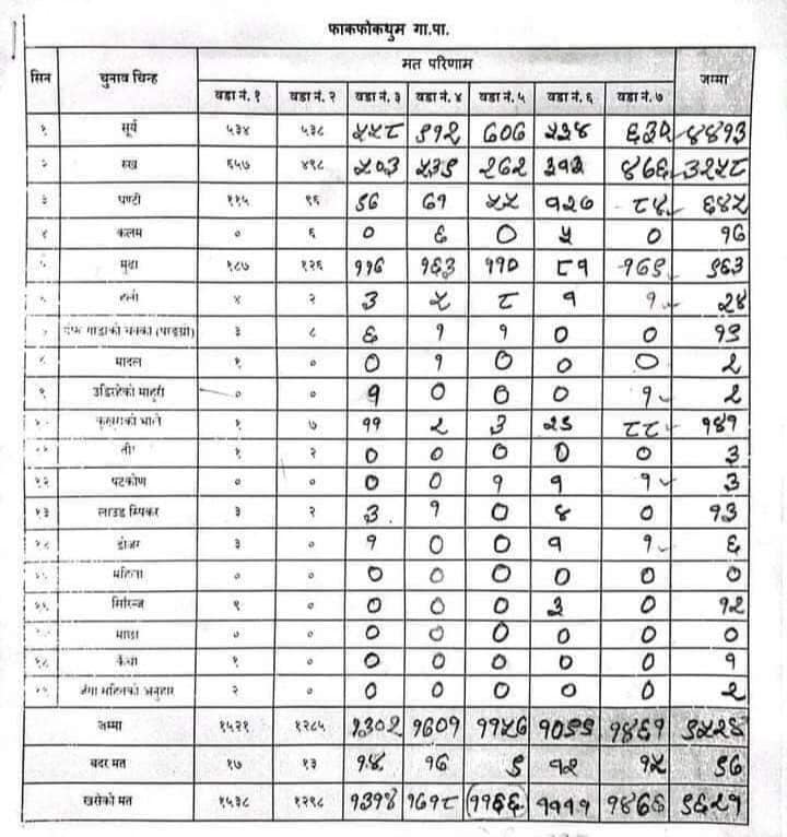 हालसम्म फाकफोक थुमका १, २, ३, ४, ५ ,६ र ७ वडाको गणना सकिदा नेम्वाङले ४ हजार ४ सय १३ मत प्राप्त गरेका छन् भने काँग्रेसका उम्मेदवार डम्वर बहादुर खड्काले ३ हजार २ सय ५८ मत पाएका छन् । १२ सय बढीको मतान्तरले नेम्वाङ लिम्वु भन्दा अघि लागेका छन् ।