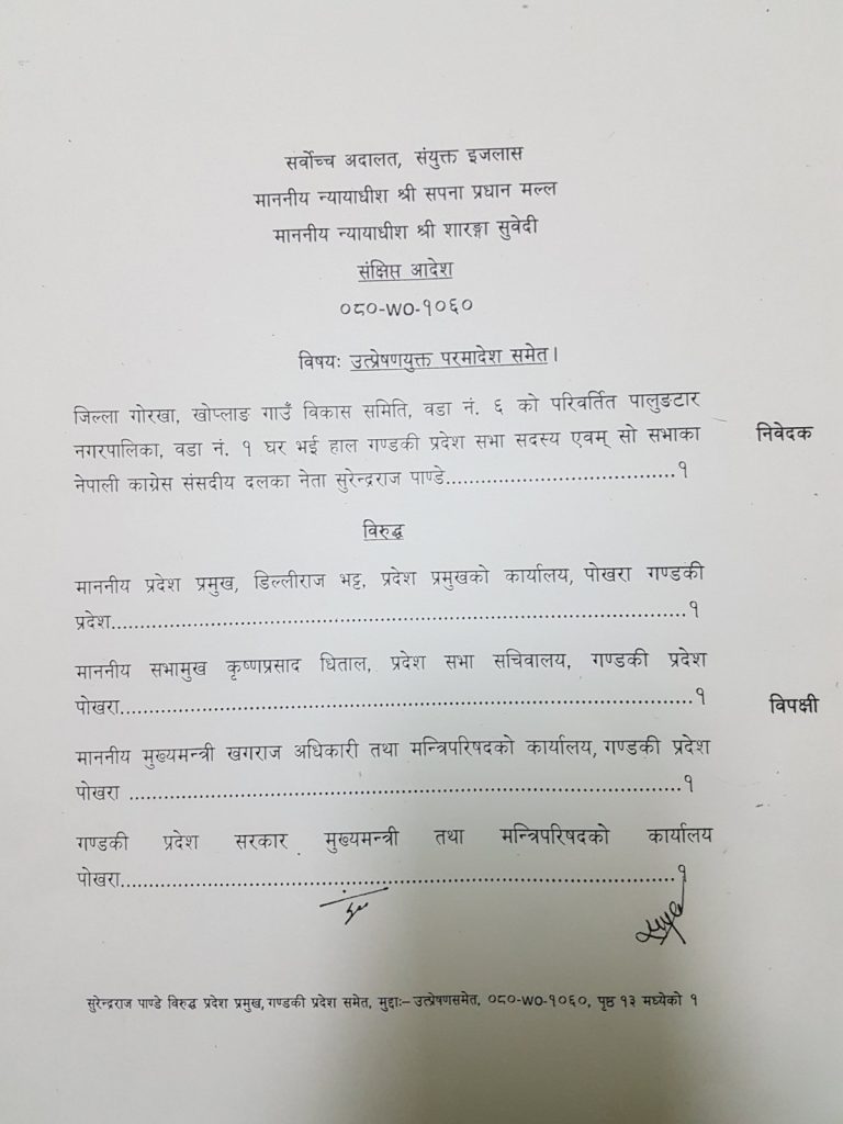 सोमबार सर्वोच्चका न्यायाधीश सपना मल्ल प्रधान र सारंगा सुवेदीको इजलासले पूर्वमुख्यमन्त्री तथा कांग्रेस संसदीय दलको नेता सुरेन्द्रराज पाण्डेले दर्ता गरेको रिट खारेज गरिदिएको हो ।