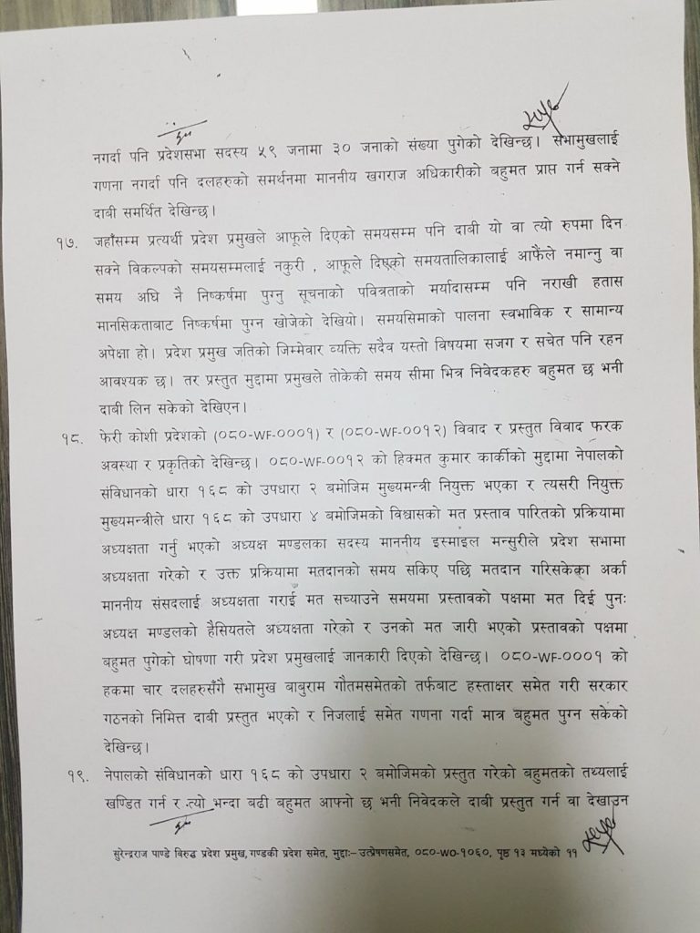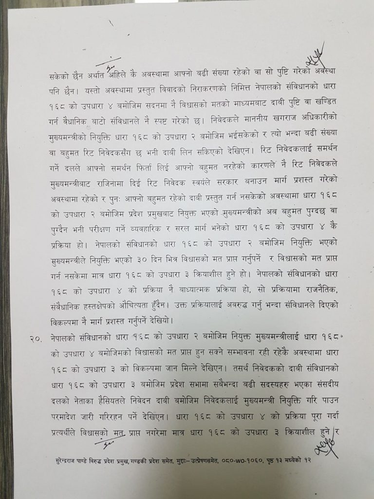 सर्वोच्चले मुख्यमन्त्रीसँग बहुमत भए नभएको परीक्षण प्रदेशसभामा बाटै हुने विकल्ल रहेको भन्दै अधिकारीको नियुक्ति बदर र पाण्डेलाई मुख्यमन्त्री बनाउन परमादेश दिन अस्वीकार गरेको हो ।