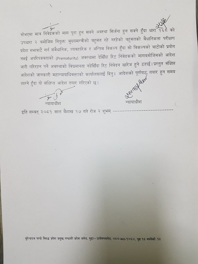 गण्डकी प्रदेशका मुख्यमन्त्री अधिकारीको नियुक्तिविरुद्ध परेको रिट खारेज