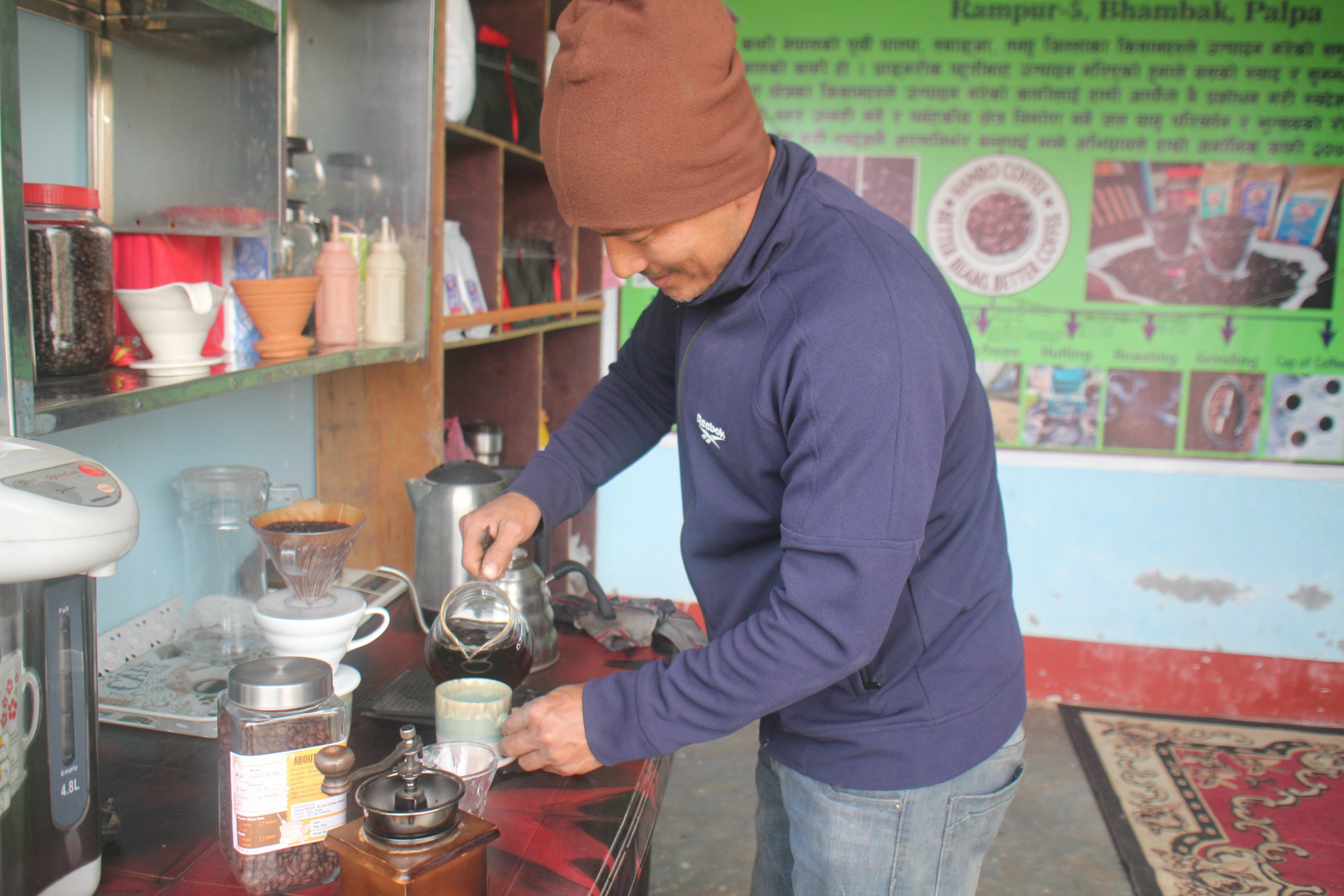 पछिल्लो पटक कामदारका रुपमा कोरीया पुग्यौं त्यहा हामीले काम गर्ने पसलमा गुल्मीमा उत्पादन भएको कफी भेटियो । त्यसैले नै मेरो मनै मोडिदियो । मेरो आफनै घर आँगनमा लटरम्म दाना लागेका कफीका बोटहरुको संझना आयो ।कोरीयाको बसाइ सकेपछि त्यस पछि कोरीया बस्न मनै लागेन । मेरो ध्यान कफीको बोट तर्फ लाग्यो गाउमा बसेर कफीको बिस्तार तर्फ लागे । यसो गर्दा घर परिवार आफन्त तथा छिमेकीको आलोचनाको पात्र मात्र बन्न पुगे । गाउमा फलेका कफीका दाना खरिद गरेर त्यसलाई प्रशोधन गरी प्याकेजीङ गरी झोलामा बोकेर वालिड्ड, पुलती बजारका सबै पसल पसल आफु पुगेको अनुभवहरु उनले धेरै बटुलेकाछन । हाम्रो मुलुकमा अर्गानीक बस्तु खोज्न र खानेको सख्या अत्यन्तै कम हुदो रहेछ । कफी भन्दा साथ विदेशी उत्पादन मात्र बुभ्mने गलत मानसिकता हुदो रहेछ हाम्री नेपालीहरुको । यो विषयमा बुझाउन नसक्नु फेरी हाम्रो पनि कमजोरी हो । विदेशमा हाम्रो उत्पादन खोज्दा रहेछन हामी भने विदेशी उत्पादन प्रवद्धन गर्न तर्फ लाग्यौ । सरकारले जति चिया उत्पादनमा लागनी गरेको छ त्यसको १० प्रतिशत पनि कफीमा लगानी गरेको भए आज पैसा कोरीयामा होइन खोरीयामा हुदोरहेछ उनी बताउछन् ।