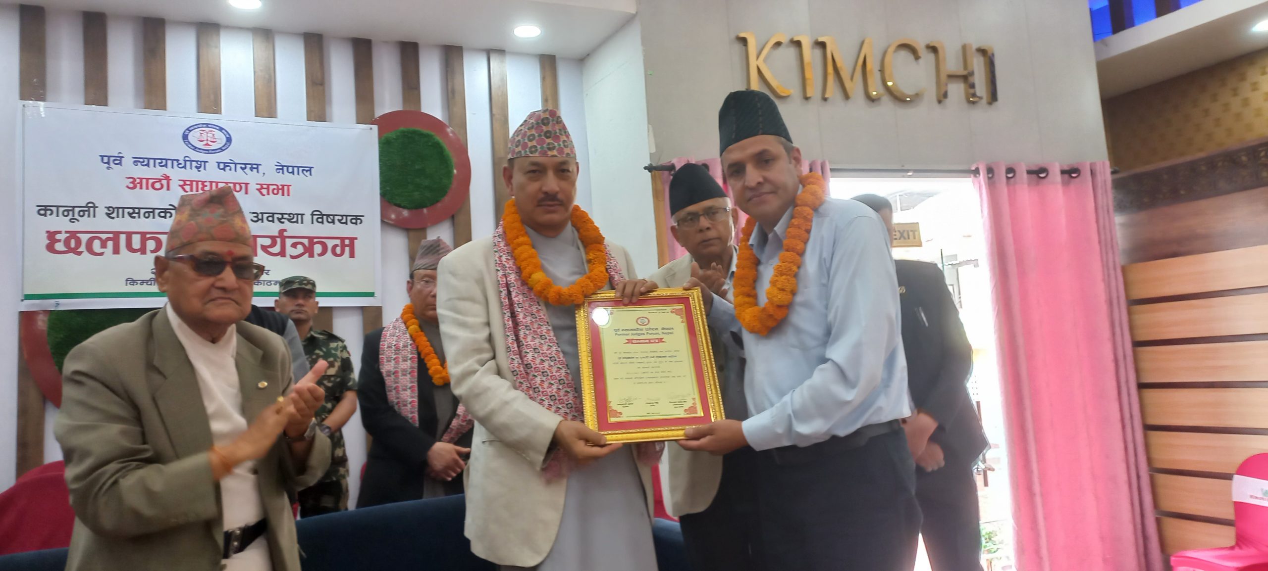 फोरमको महासचिव शम्भुबहादुर खड्काले कानुनी शासनको वर्तमान अवस्थाबारे विधायिका, कार्यपालिका र न्यायपालिकाको भूमिका विषयमा संस्थाको दृष्टिकोण प्रस्तुत गर्नुभयो । त्यस अवसरमा संस्थाका आजीवन सदस्य एवं पूर्वन्यायाधीश स्वर्गीय रामहरि शर्माका स्मृतिमा उहाँकी धर्मपत्नी देवकुमारी फुँयाल र छोरा नरेश फँुयालबाट पूर्वन्यायाधीश फोरम नेपाललाई रु एक लाख सहयोग पुर्याएवापत योगदानको कदर गर्दै संस्थाले उहाँहरूलाई सम्मानपत्र प्रदान गर्यो ।