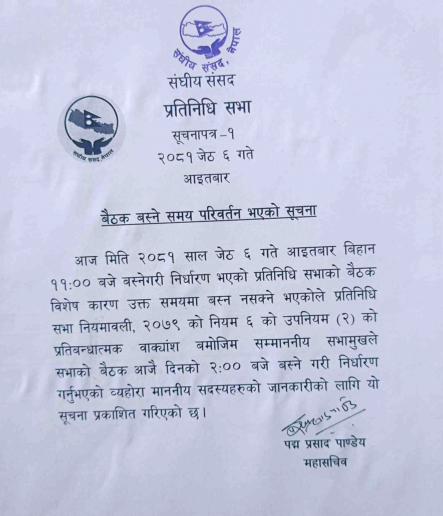 काठमाडौं- आज बिहान ११ बजे बस्नेगरी तय भएको प्रतिनिधिसभाको बैठक आजै दिउँसो २ बजेका लागि सारिएको छ । प्रतिनिधिसभाका महासचिव पद्मप्रसाद पाण्डेयले विशेष कारणबस तोकिएको समयमा बैठक बस्न नसकेपछि समय परिवर्तन गरिएको जानकारी दिनुभयो ।