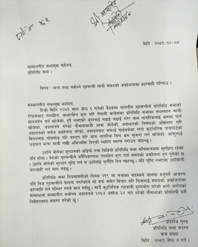 ”उहाँले बोलेका कुराहरुको अडियो तथा भिडियो प्रतिनिधि सभा सचिवालयमा सुरक्षित रहेको पनि होला । देशको गृहमन्त्रीले अनैतिकरुपमा तथ्यहिन कुरा गर्दा संसदको अवहेलना हुन पुगेको छ । उहाँले बोलेको कुराहरु पुष्टि गर्न म उहाँलाई चुनौति दिन चाहन्छु । यदि पुष्टि नभएमा उहाँमाथी कारवाही गर्न माग गर्दछु” निवेदनमा गुरुङले लेख्नु भएको छ ।