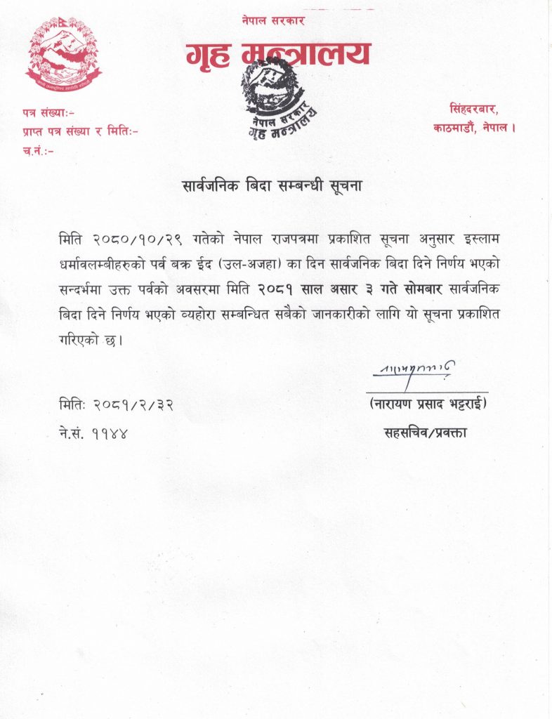 गृह मन्त्रालयले आज एक विज्ञप्ति जारी गर्दै बक्र ईदका अवसरमा असार ३ गते सोमबार सार्वजनिक बिदा दिइएको जानकारी गराएको हो ।