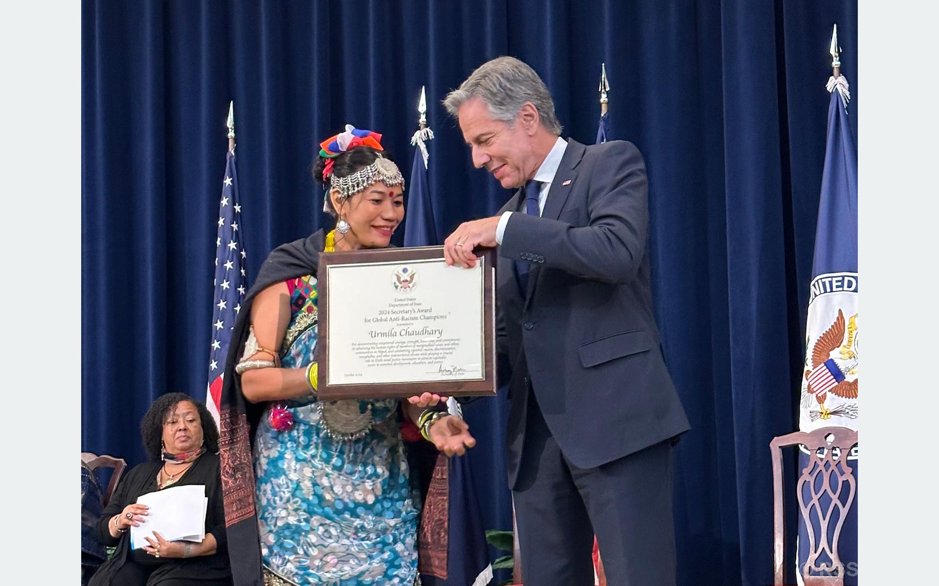 वाशिङ्गटन डिसी (अमेरिका)- नेपालकी सामाजिक अभियन्ता उर्मिला चौधरीे ग्लोबल एन्टी रेसिजम च्याम्पेनसिप अवार्डद्वारा सम्मानित हुनुभएको छ । अमेरिकी विदेशमन्त्री एन्टोनी व्लिङ्केनले चौधरीसहित छ देशका सामाजिक अभियन्तालाई सोमबार यहाँ आयोजित कार्यक्रममा उक्त अवार्ड प्रदान गर्नुभएको थियो ।