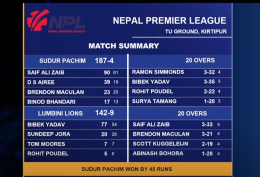 त्रिभुवन विश्वविद्यालय क्रिकेट मैदान कीर्तिपुरमा टस हारेर पहिले ब्याटिङको निम्तो पाएको सुदूरपश्चिमले एक सय ८७ रन लक्ष्य प्रस्तुत गरेको थियो । खेलमा लुम्बिनी लाइन्सले ९ विकेटको क्षतिमा जम्मा मात्र १४२ रन मात्र बनाउन सफल भयो ।