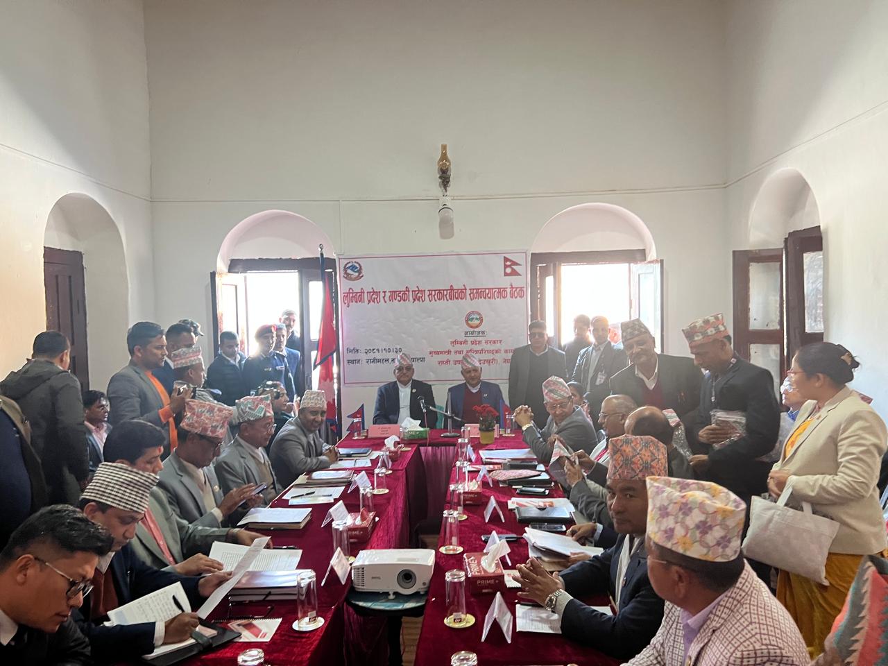 संविधानको धारा ५६, २३३, अनुसूची ६ र ९ मा उल्लेखित व्यवस्थाअनुसार लुम्बिनी र गण्डकी प्रदेशको समग्र विकासका सवाल, साझा सम्भावनाहरू संयुक्त रुपमा सम्बोधन गर्ने उद्देश्यले पहिलो पटक लुम्बिनी प्रदेश सरकारले बैठकको आयोजना गरेको थियो ।