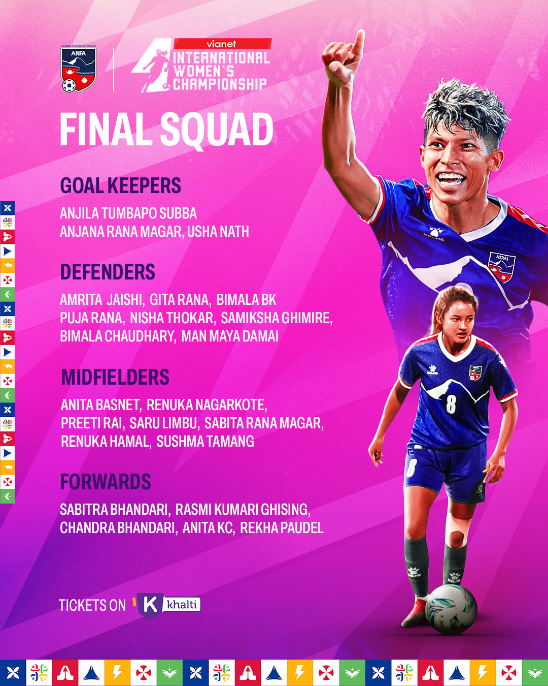 डिफेन्डर मनमाया दमाई र मिड फिल्डर सुष्मा तामाङ हमाललाई पहिलो पटक समेटिएको राष्ट्रिय टोलीमा मिड फिल्ड चन्द्रा भण्डारी र रेनुका हमालले पनि पुनरागमन गरेका छन् । नेपाली टोलीमा संलग्न खेलाडीहरु यसप्रकार छन :