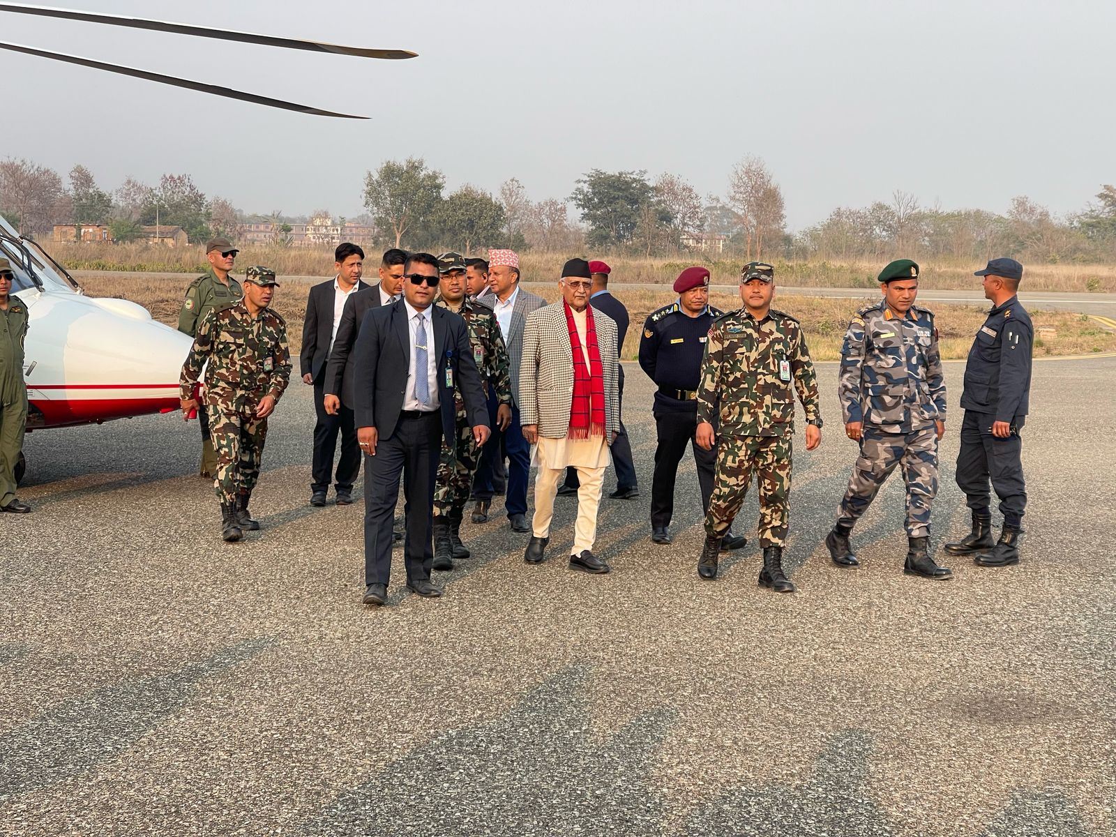 प्रधानमन्त्रीसँगै नेकपा (एमाले) महासचिव शङ्कर पोखरेल, लुम्बिनी प्रदेशका मुख्यमन्त्री चेतनारायण आचार्य, राष्ट्रियसभाका पूर्वसदस्य कोमल वलीलगायतले विमानस्थल अवलोकन गर्नुभयो ।