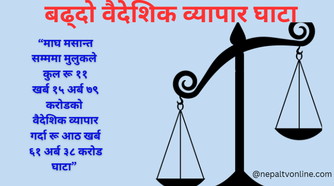 भन्सार विभागले सार्वजनिक गरेको माघ मसान्तसम्मको वैदेशिक व्यापारको अवस्था प्रतिवेदनअनुसार यो अवधिमा रू नौ खर्ब ८८ अर्ब ५८ करोडको आयात र रू एक खर्ब २७ अर्ब २० करोडको निर्यात भएको हो । विभागका अनुसार गत आर्थिक वर्षको सोही अवधिको तुलनामा चालु आर्थिक वर्षमा आयात १० दशमलव ०९, निर्यात ४६ दशमलव ५० र कूल वैदेशिक व्यापार १३ दशमलव ३० प्रतिशतले बढेको छ । त्यस्तै, गत आर्थिक वर्षको तुलनामा समीक्षा अवधिमा कुल वैदेशिक व्यापारघाटा छ दशमलव २० प्रतिशतले बढेको छ । कूल वैदेशिक व्यापारमा आयातको हिस्सा ८८ दशमलव ६० र निर्यातको हिस्सा ११ दशमलव ४० प्रतिशत रहेको छ ।
