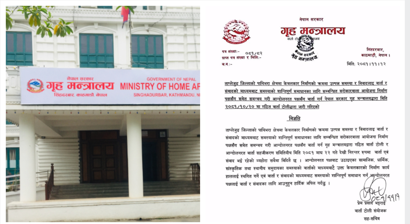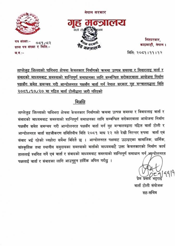 गृहमन्त्रालयका सह-सचिव प्रेमप्रसाद भट्टराईले सोमबार एक सूचना जारी गरी आन्दोलनरत पक्षलाई वार्तामा आउन आग्रह गर्नु भएको हो ।
