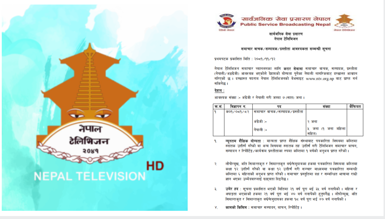 सूचना अनुसार नेपाल टेलिभिजन समाचार च्यानलका लागि दुई जना अंग्रजी समाचारतर्फ र ५ जना नेपाली समाचारतर्फ माग गरिएको हो ।