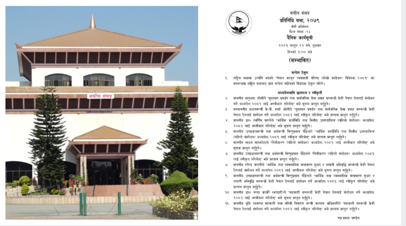 काठमाडौँ-भोलि मध्याह्न १ बजेका लागि बोलाइएको सङ्घीय संसद्, प्रतिनिधिसभामा सरकारले ल्याएको पाँच वटा अध्यादेश स्वीकृतिका लागि निर्णयार्थ पेस हुने भएको छ ।