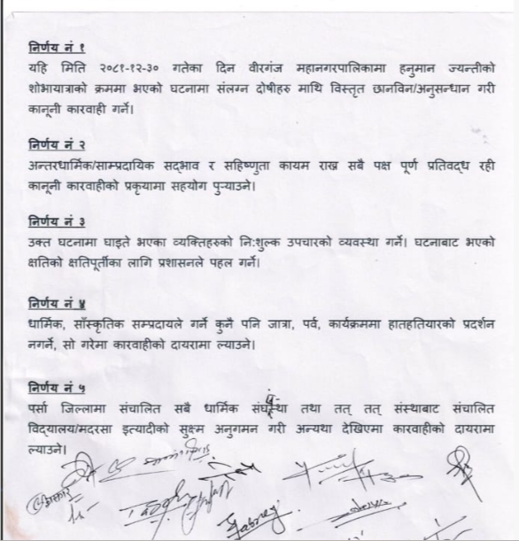 काठमाडौँ- वीरगन्जमा आइतबार बसेको सर्वपक्षीय बैठकले सबै धर्म र समुदायबिच आपसी सदभाव कायम राख्ने सहमति गरेको छ ।जिल्ला प्रशासन कार्यालय पर्साममा आइतबार बसेको सर्वपक्षीय बैठकले यस्तो सहमति गरेको हो ।