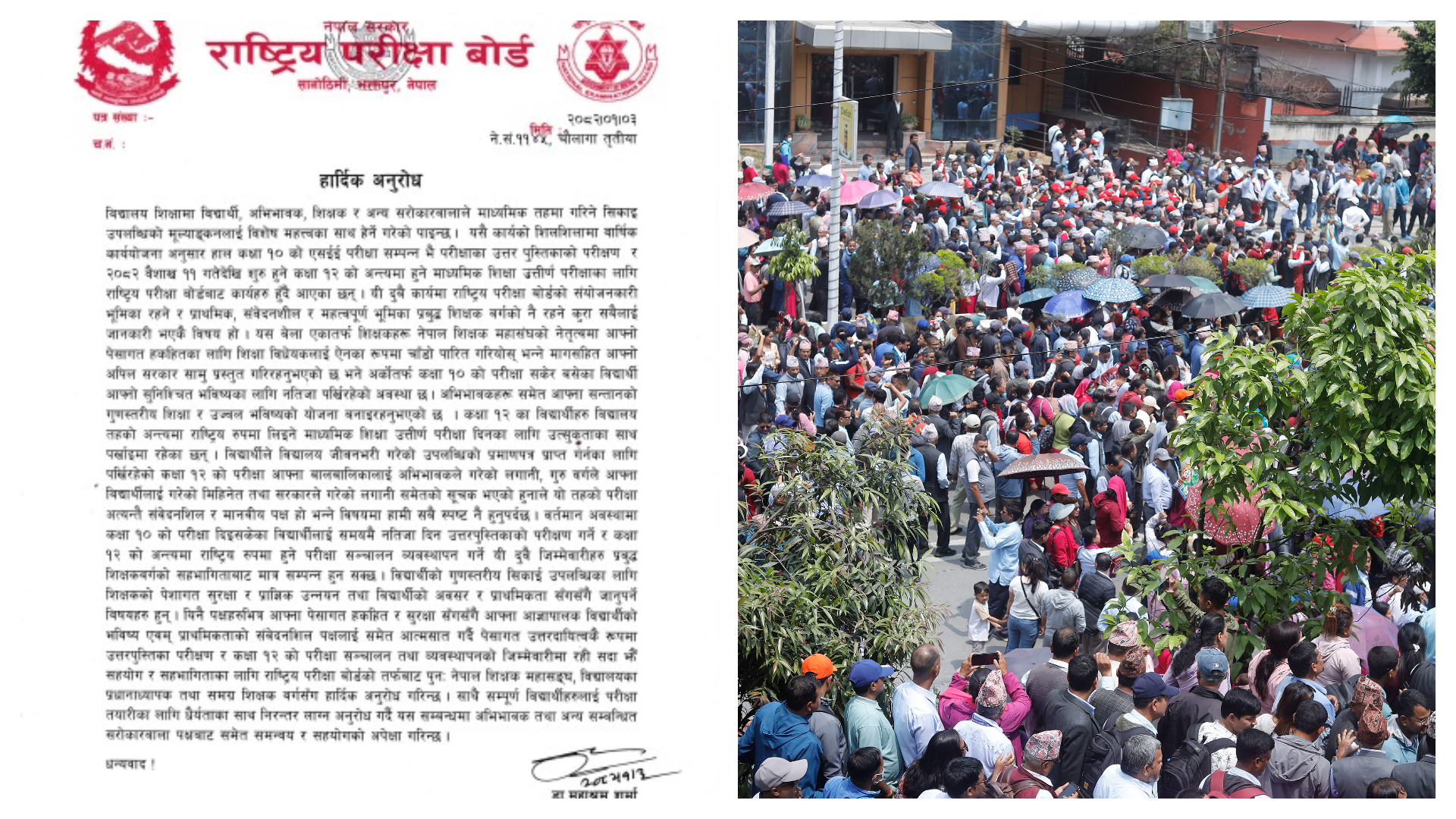 यसअघि पनि बोर्डले शिक्षकहरुलाई कक्षा १२ को परीक्षा संचालन र एसइईको उत्तरपुस्तिका परीक्षणमा सहयोग गर्न अनुरोध गरेको थियो । तर शिक्षकहरुले भने आफ्नो माग पुरा नभएसम्म आन्दोलन जारी राख्ने अडान दोहोर्याएका छन ।
