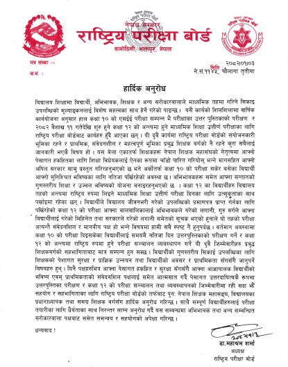 बोर्डका अध्यक्ष डा महाश्रम शर्माले जारी गर्नुभएको अनुरोध पत्रमा आफ्नो पेशाग हकहित र सुरक्षासँगसँगै आफ्ना आज्ञापालक विद्यार्थीको भविष्य एवं प्राथमिकताको संवेदनशील पक्षलाई समेत आत्मसाथ गर्दै पेशागत उत्तरदायित्वकै रुपमा उत्तरपुस्तिका परीक्षण र कक्षा १२ को परीक्षा सञ्चालन तथा व्यवस्थापनको जिम्मेवारीमा रही सहयोग गर्न अनुरोध गरिएको छ ।