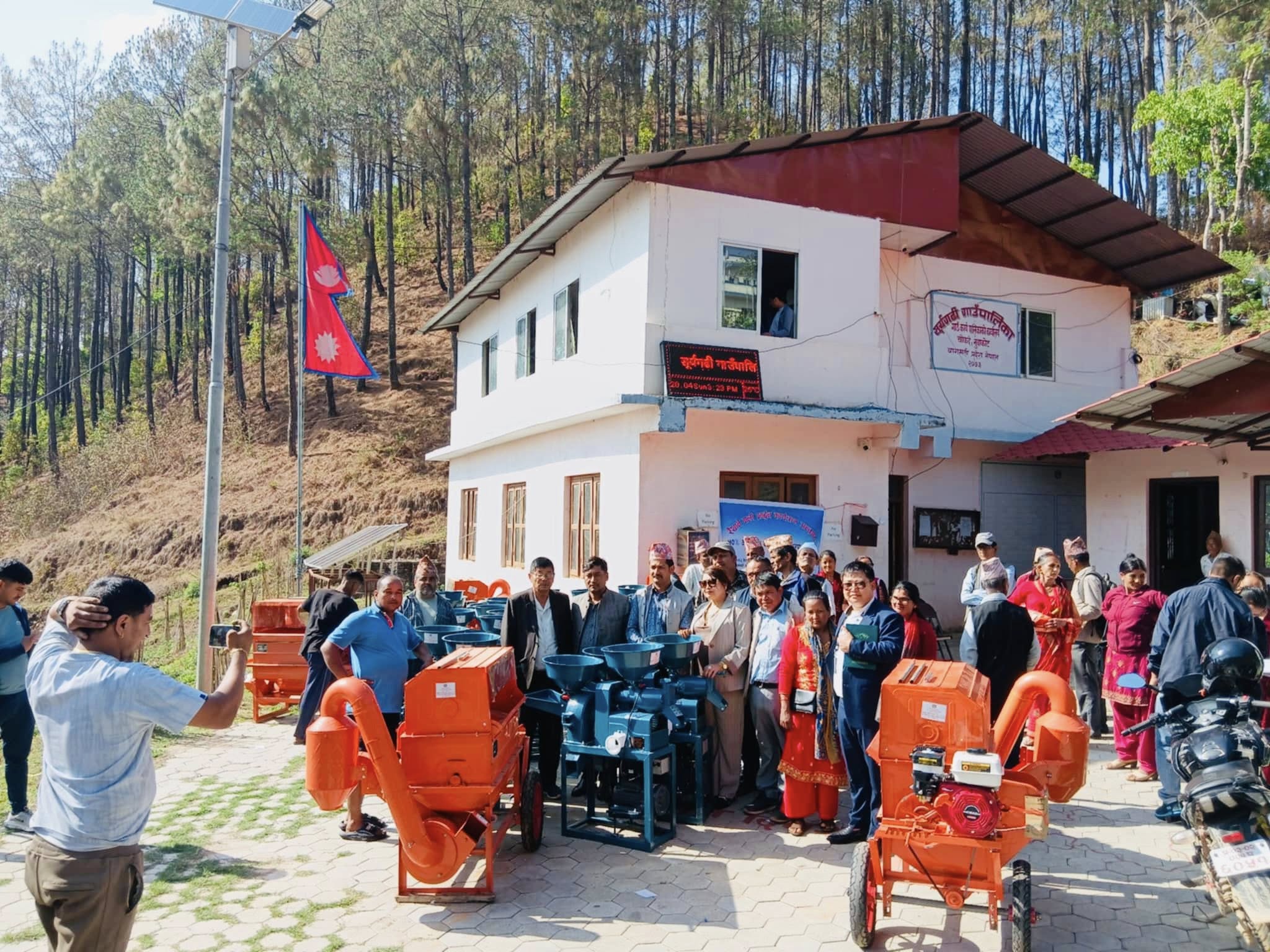 किसानहरूलाई २४ थान कम्बाइन मिल तथा मल्टीक्रप थ्रेसर सूर्य गढी गाउँपालिकाका अध्यक्ष सन्तबहादुर घले, उपाध्यक्ष मञ्जु बुढाथोकी (ढकाल)लगायतले हस्तान्तरण गर्नुभयो । अधयक्ष घलेले उत्पादन बढाइँ कृषिमा आत्मनिर्भर भई रैथाने बालीलाई प्रमुखता दिन किसानहरूलाई आग्रह गर्नुभयो।
