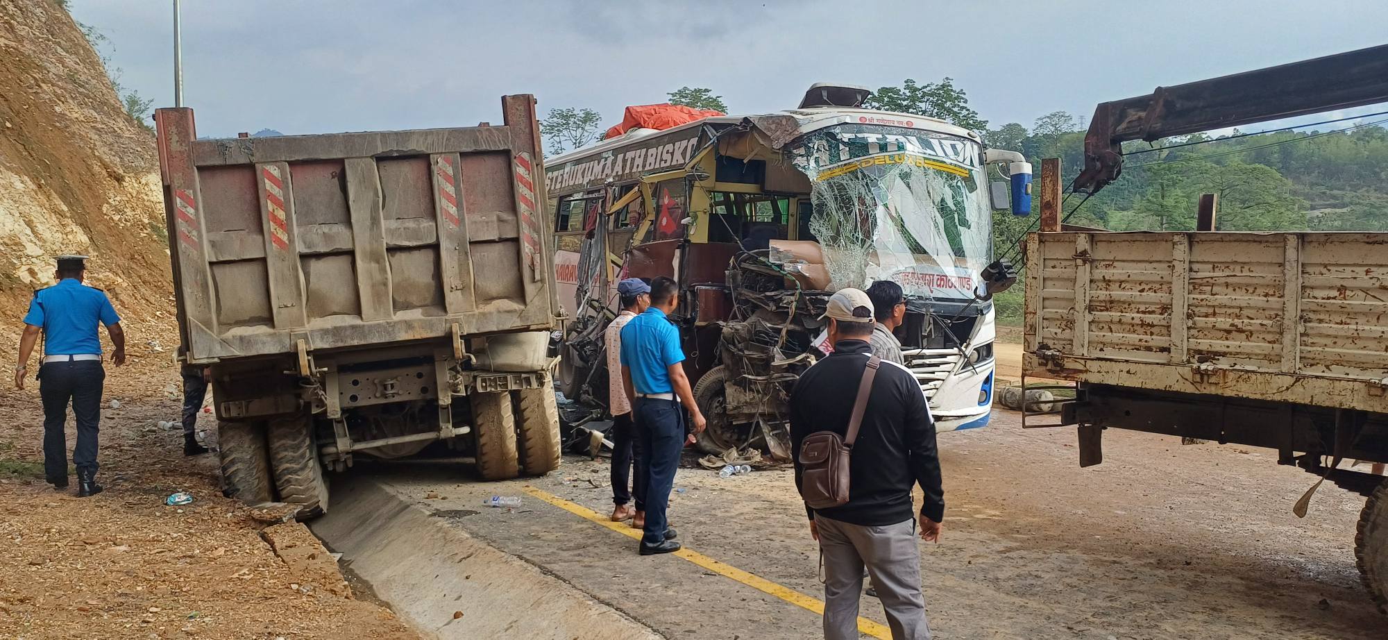 तनहुँमा बस र टिप्पर एकआपसमा ठक्कर खाँदा सात जना घाईते