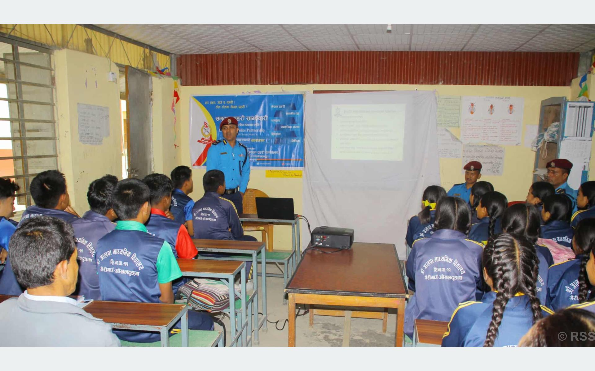 ‘साइबर’ कानुनबारे गाउँका विद्यार्थीलाई पढाउँदै प्रहरी
